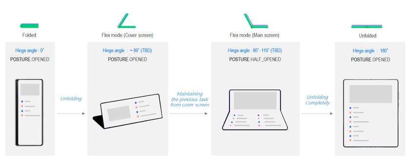 Документ на сайте Samsung для разработчиков говорит о том, что Flex Mode — это режим, в котором дисплей приоткрыт и он имеет два состояния (мы уже знаем о том, что это раскрытие на 75 и 115 градусов, а также о технологии под названием CAM, которая позволяет это фиксировать). При 75 градусах используется внешний экран (например, для просмотра видео или видеозвонков), вторая часть смартфона при этом играет роль удобной подставки (да, это выглядит пока небольшим преимуществом для смартфона ценой в пару тысяч долларов, но подумайте о том, как быстро изменится мир и через несколько лет такие устройства завоюют рынок). Больше не нужно держать смартфон в руках или искать какую-то замену подставки, прислоняя его куда-то, откуда телефон рискует соскользнуть и лечь плашмя.