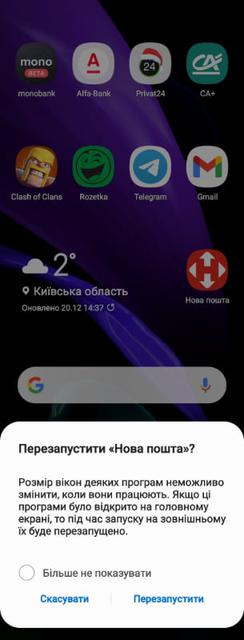При этом, если приложение работает на внешнем дисплее, то при открытии смартфона, оно сразу же будет работать в полноэкранном режиме, но наоборот это, в случае с Новой почтой, к сожалению, не работает: смартфон предложит перезапустить его на внешнем экране: