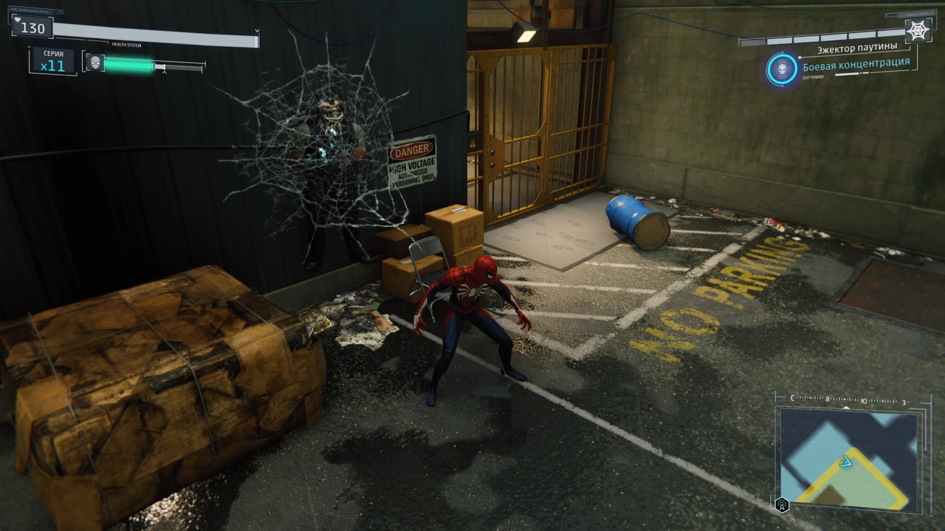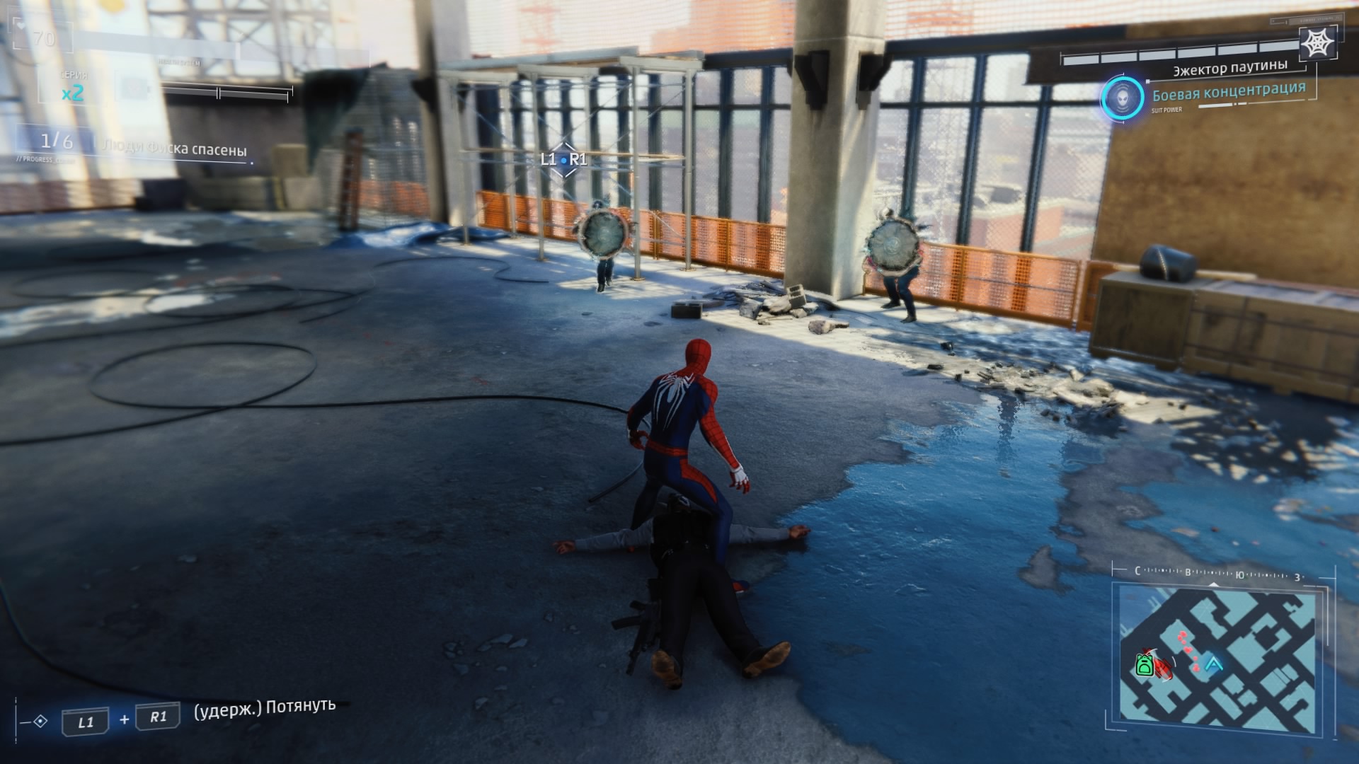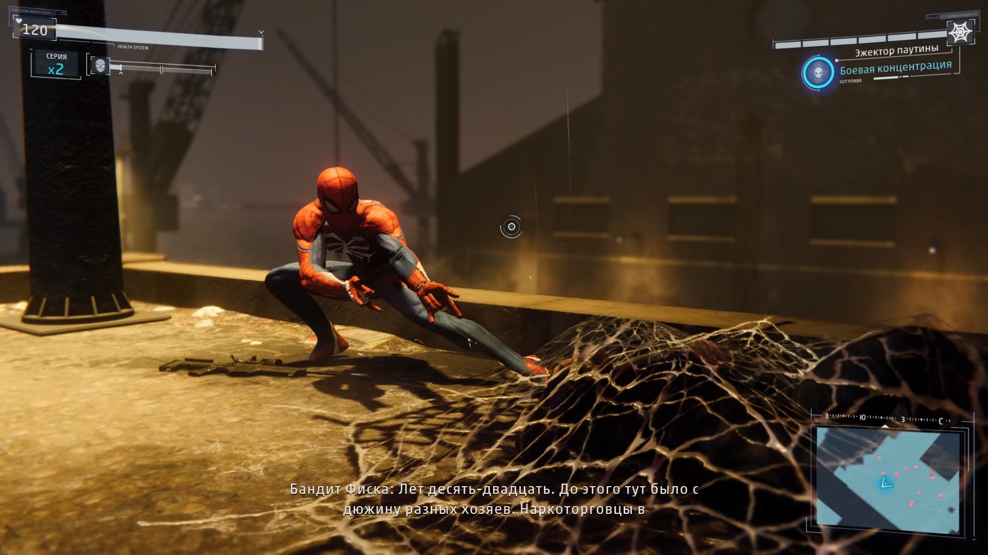 В дополнение к этому у Питера Паркера есть куча дополнительных гаджетов, которые очень помогают в бою: ловушки, паутинные бомбы, электрозаряды и многое другое. Часть более действенны при прямой стычке, часть больше подойдут для бесшумного устранения врагов. Враги тоже бывают разные, с различным оружием и особенностями. Просто так "в лоб" отметелить всех не получится. Есть враги, которые отражают любые прямые рукопашные атаки, есть — которые блокируют дальние атаки паутиной.