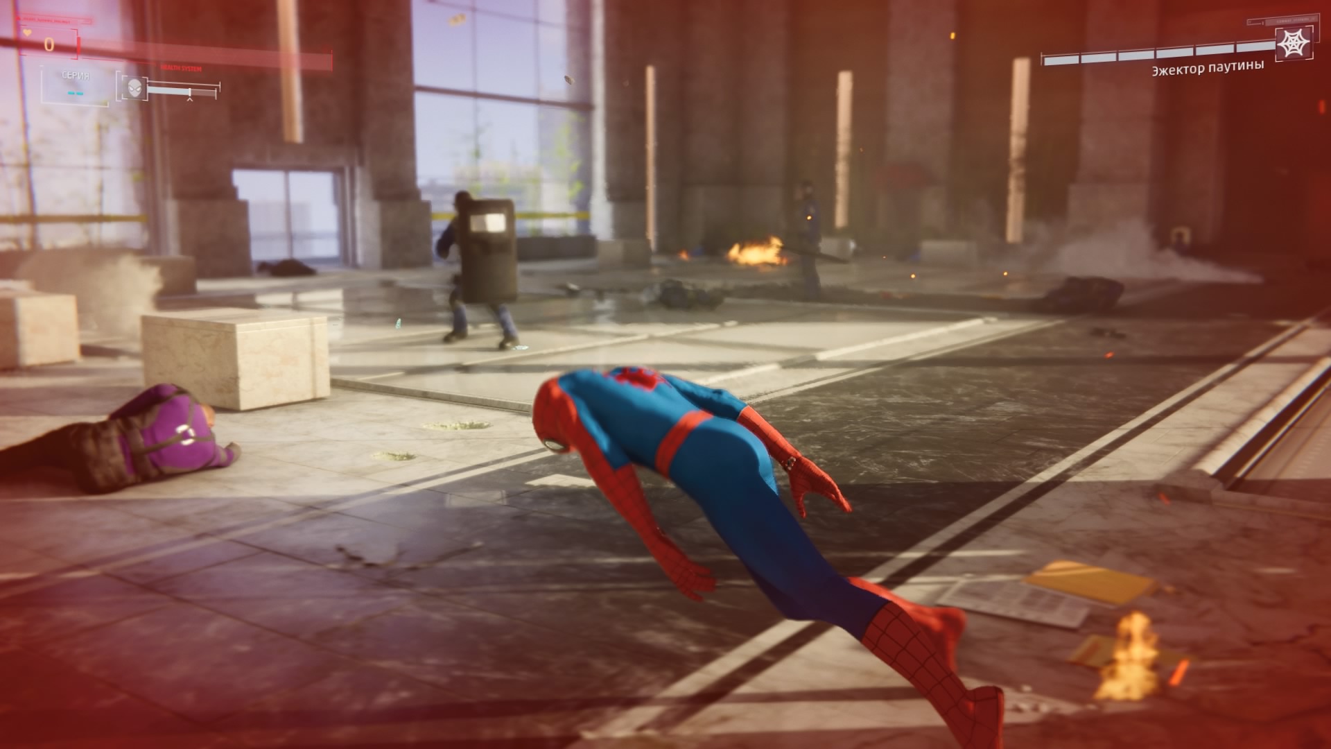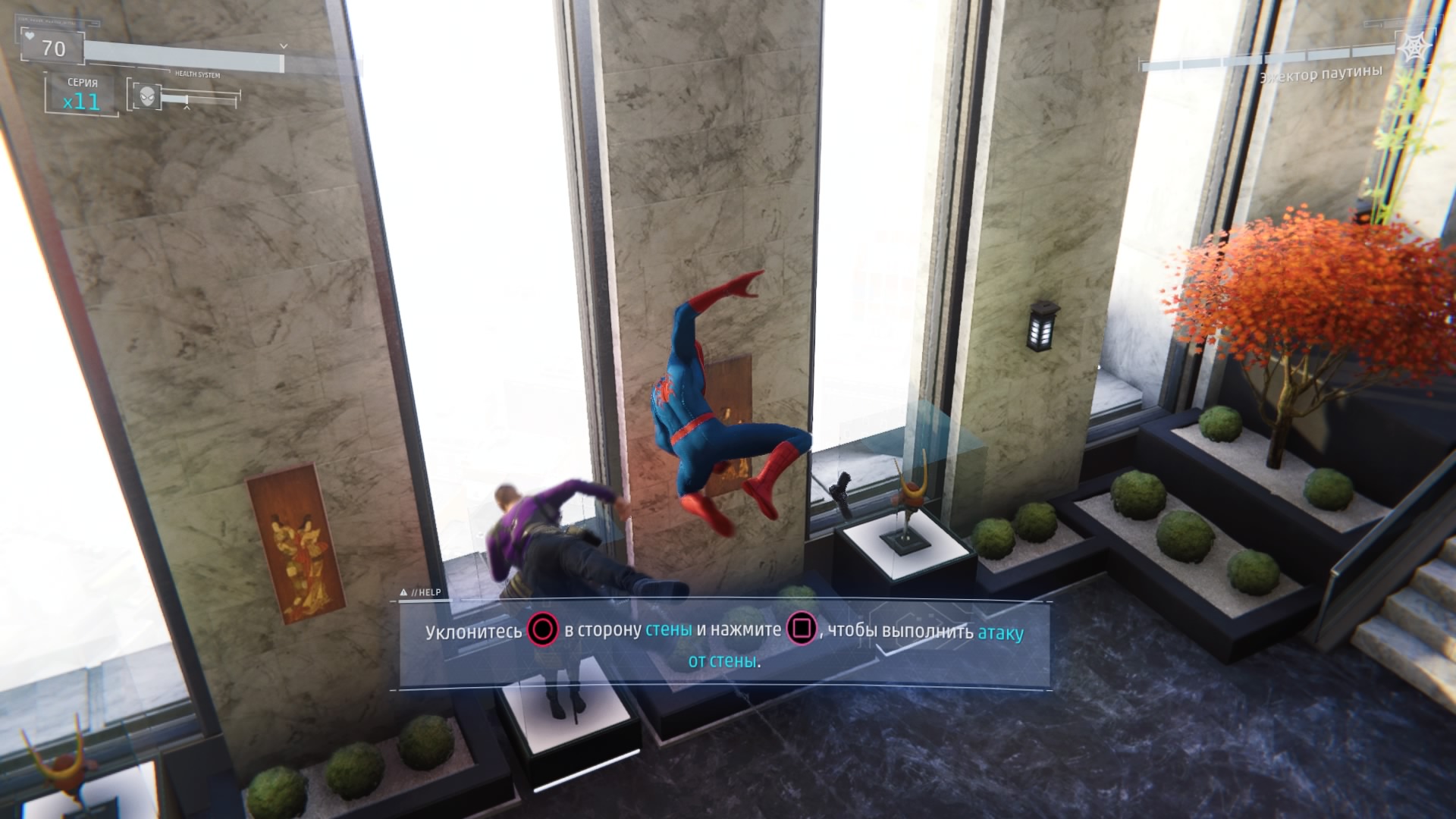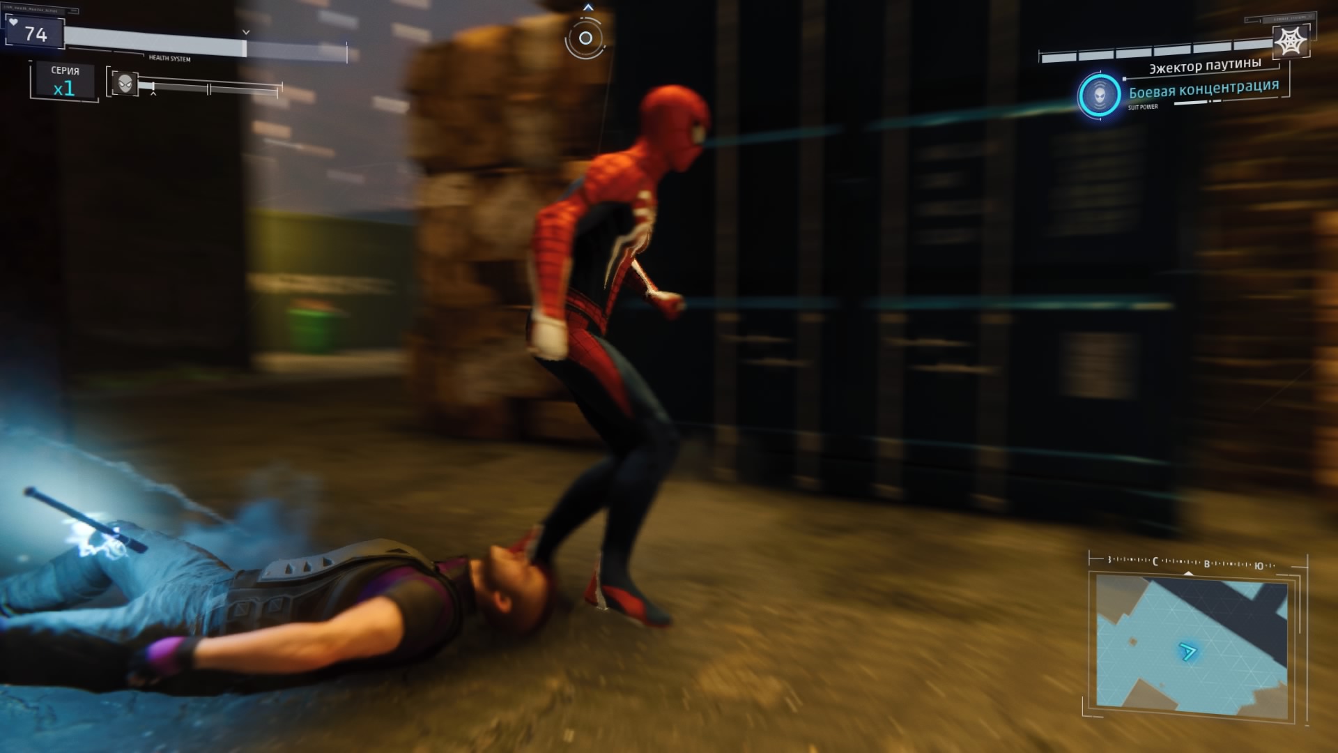 В дополнение к этому у Питера Паркера есть куча дополнительных гаджетов, которые очень помогают в бою: ловушки, паутинные бомбы, электрозаряды и многое другое. Часть более действенны при прямой стычке, часть больше подойдут для бесшумного устранения врагов. Враги тоже бывают разные, с различным оружием и особенностями. Просто так "в лоб" отметелить всех не получится. Есть враги, которые отражают любые прямые рукопашные атаки, есть — которые блокируют дальние атаки паутиной.