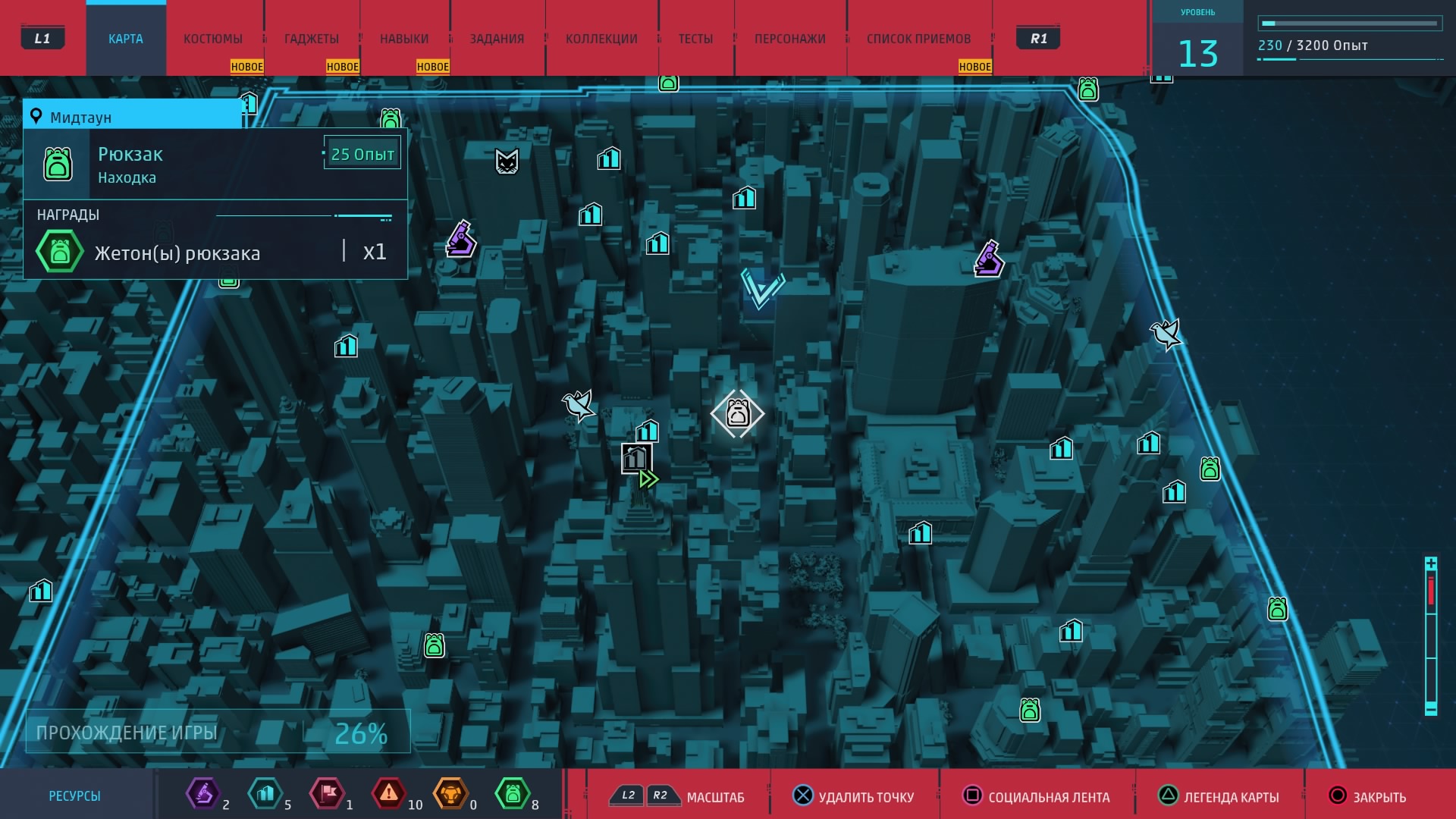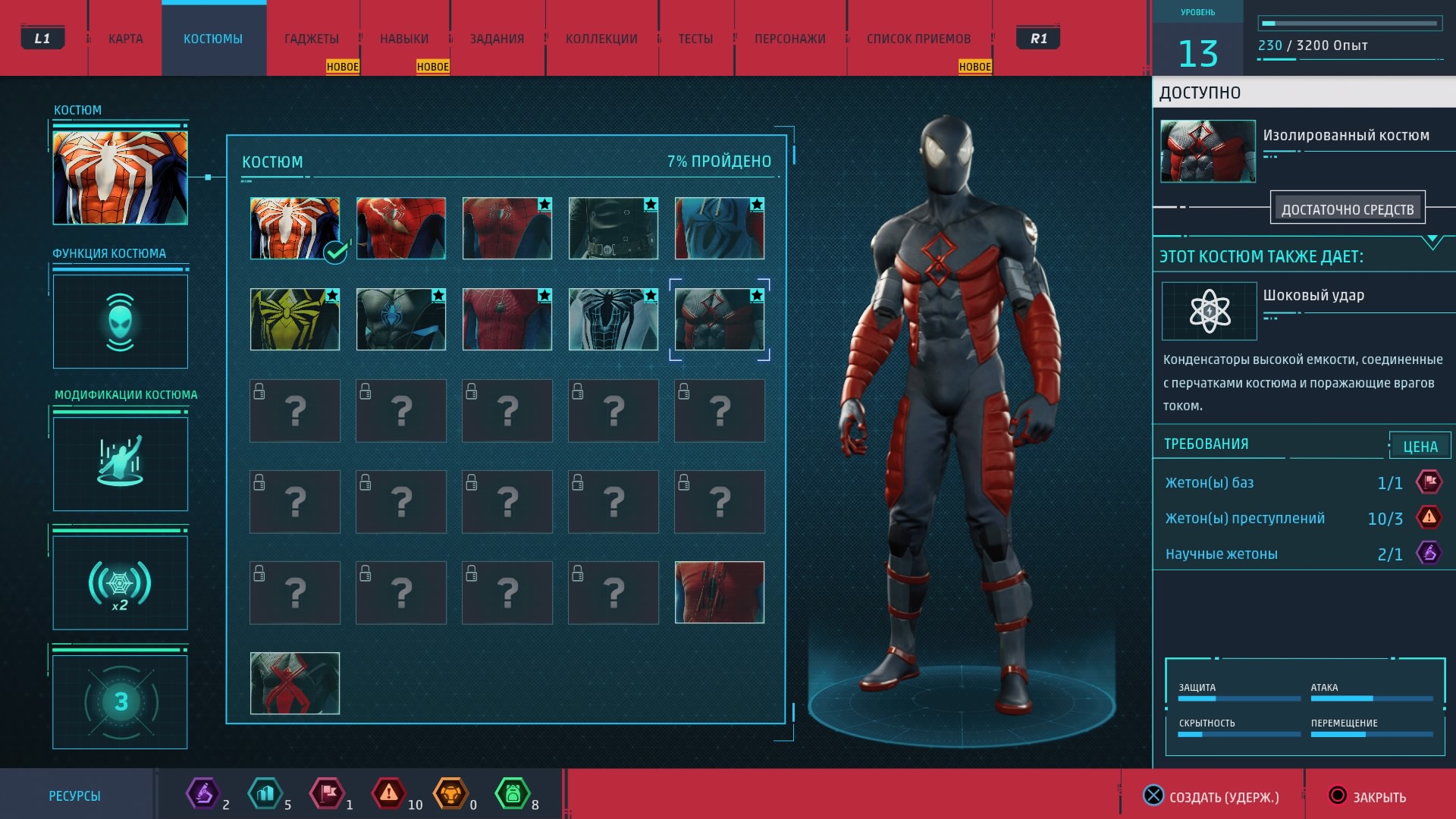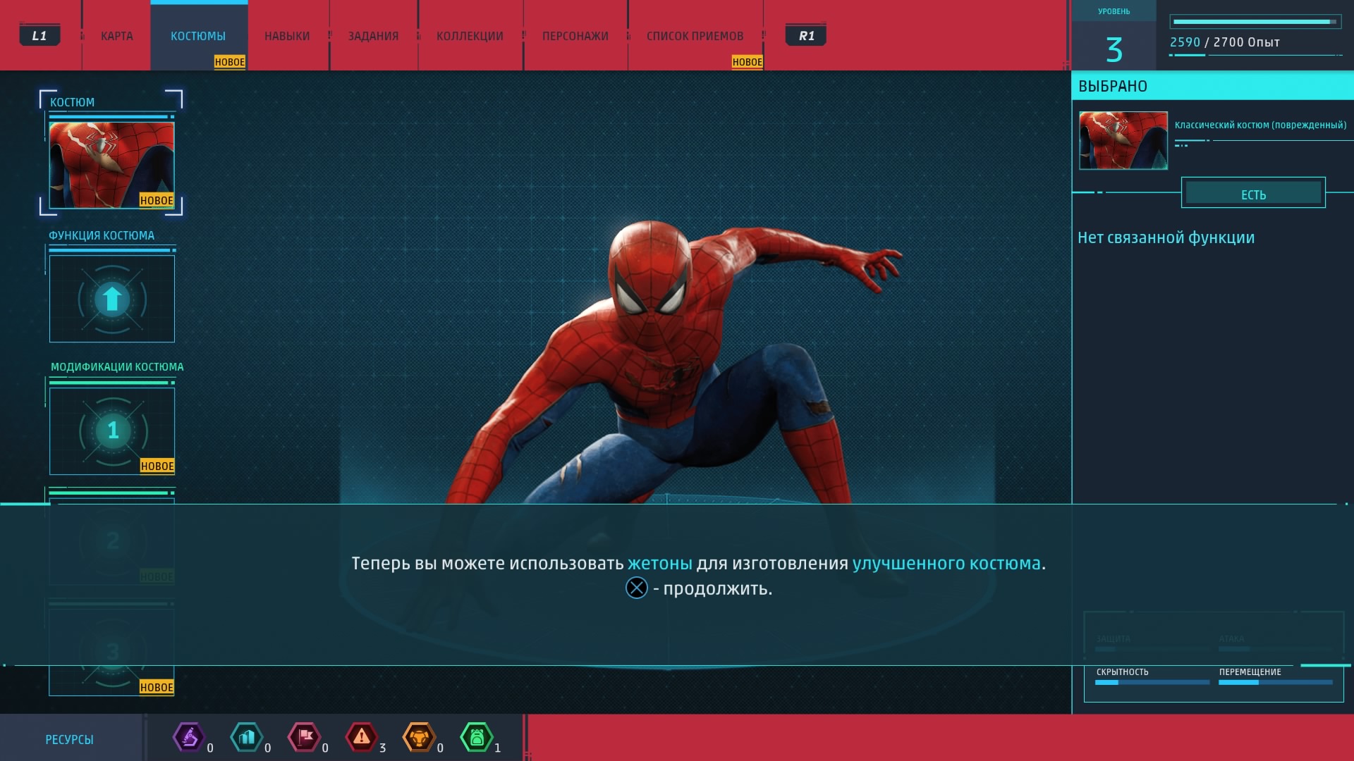 Новые костюмы и гаджеты предоставляют Человеку-пауку новые возможности. Для их создания и улучшения как раз и нужны упомянутые выше жетоны, которые игрок получает за выполнение побочных заданий. Эти жетоны бывают разных типов (за разные виды дополнительной деятельности) и нужны. И не отдельно, а все вместе, так что всё-таки без побочных активностей и "собирательства" нормально прокачаться не получится.