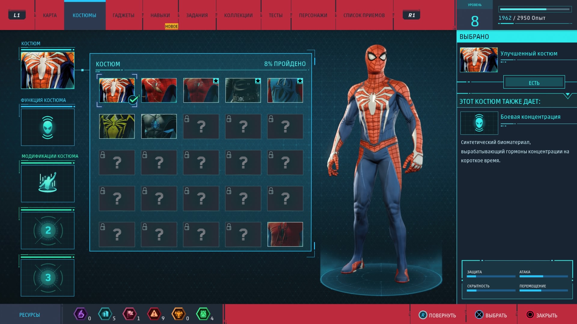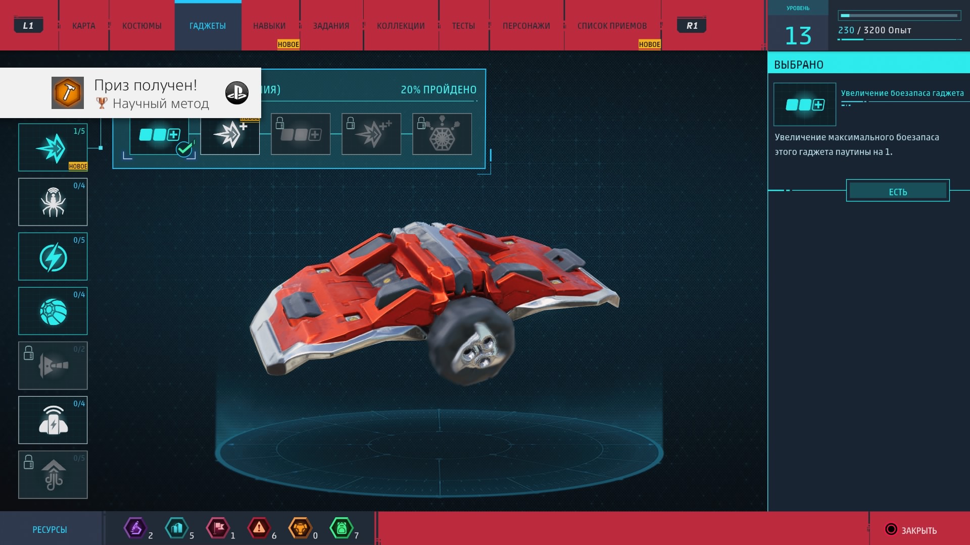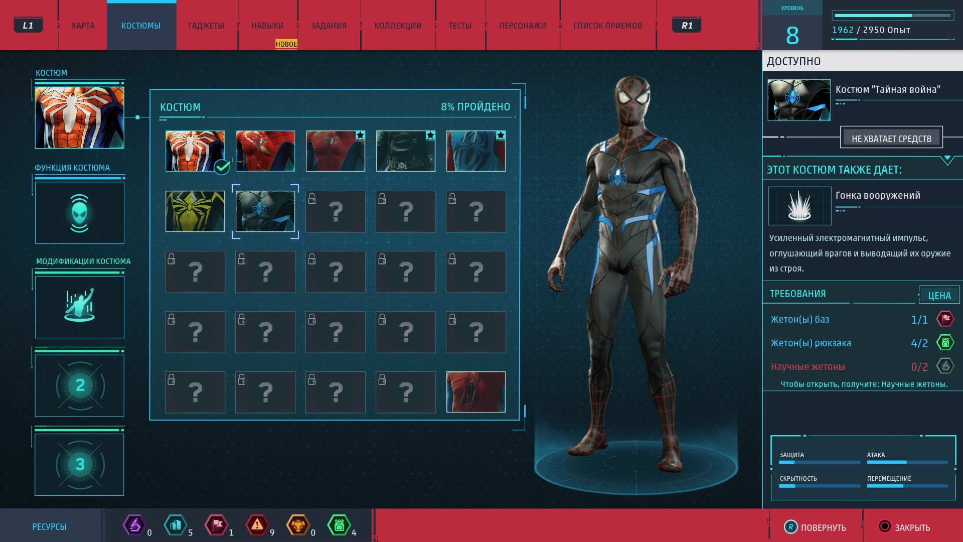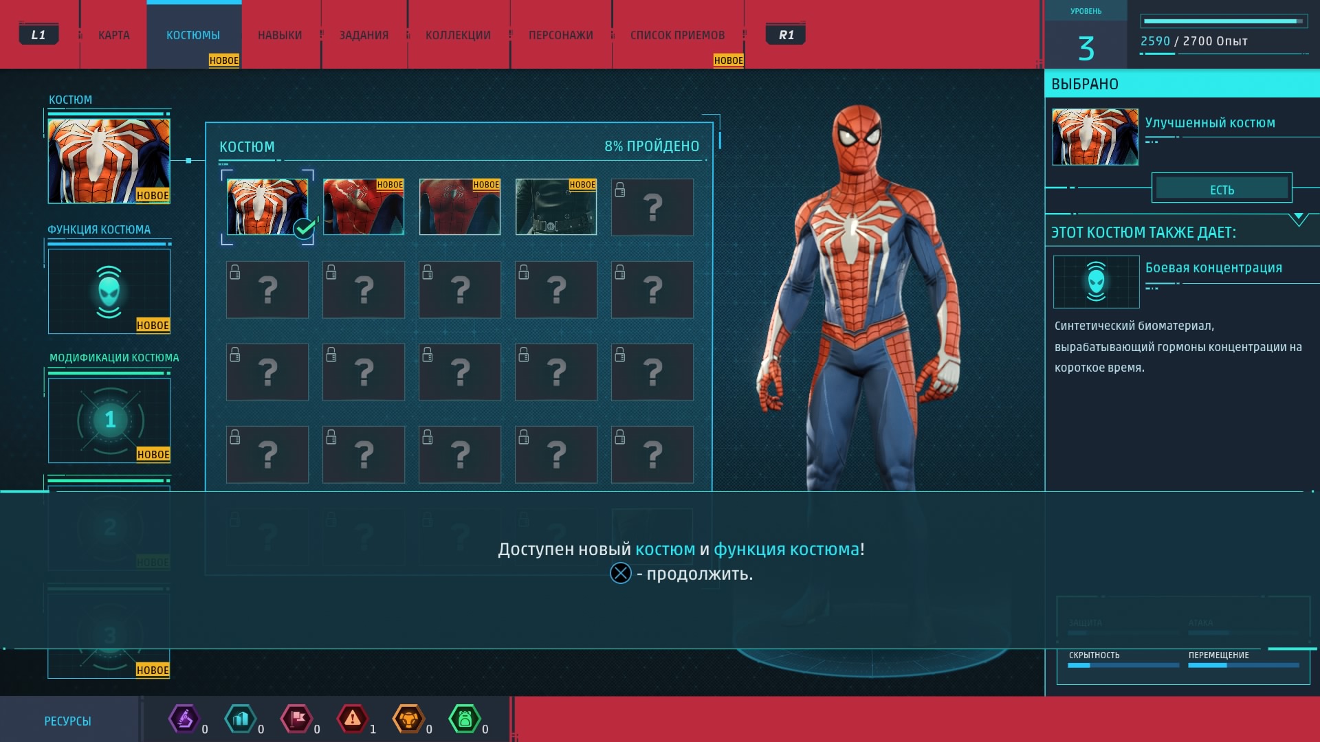 Новые костюмы и гаджеты предоставляют Человеку-пауку новые возможности. Для их создания и улучшения как раз и нужны упомянутые выше жетоны, которые игрок получает за выполнение побочных заданий. Эти жетоны бывают разных типов (за разные виды дополнительной деятельности) и нужны. И не отдельно, а все вместе, так что всё-таки без побочных активностей и "собирательства" нормально прокачаться не получится.
