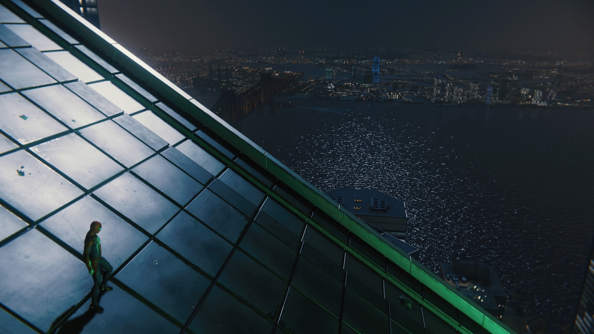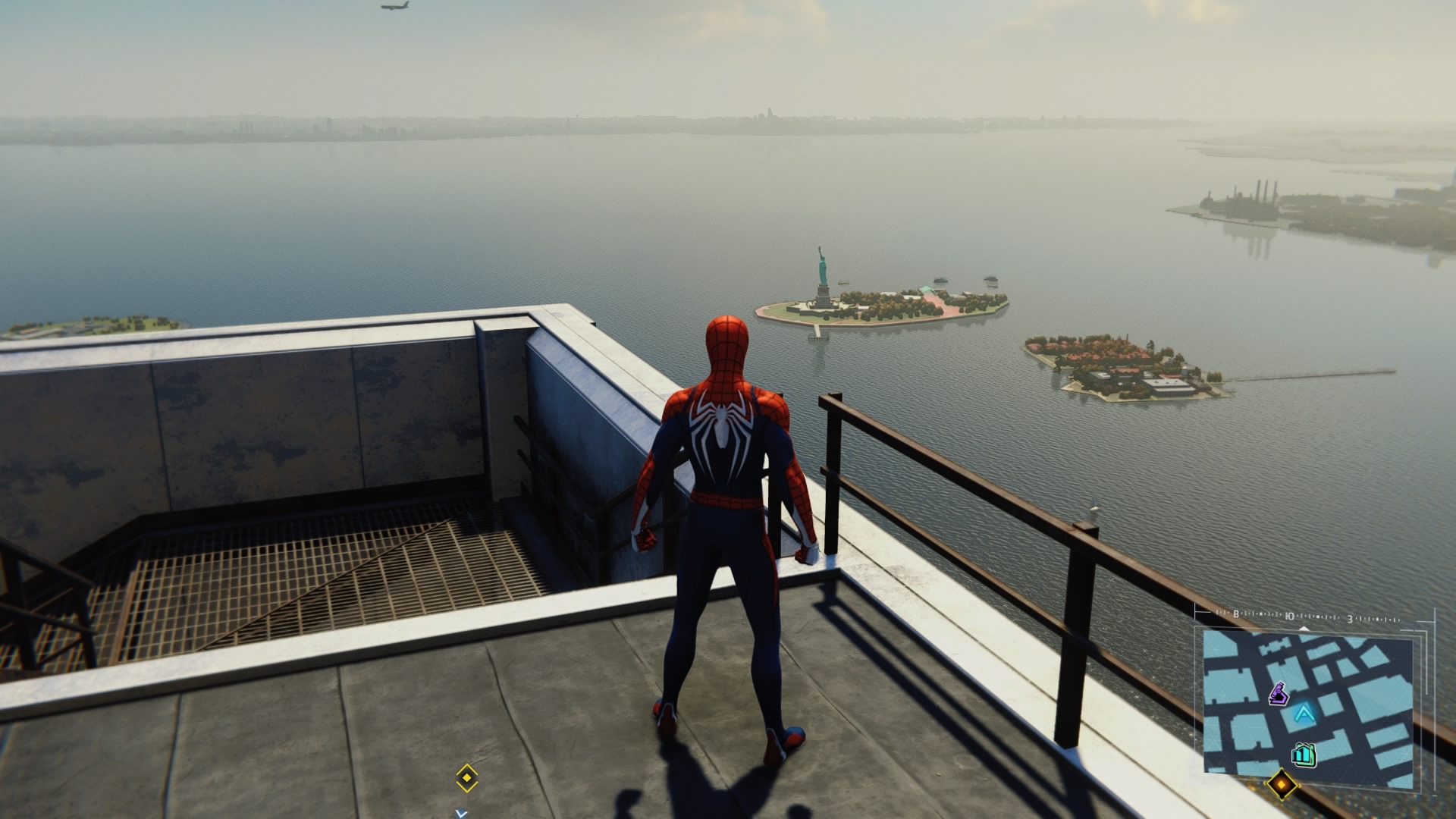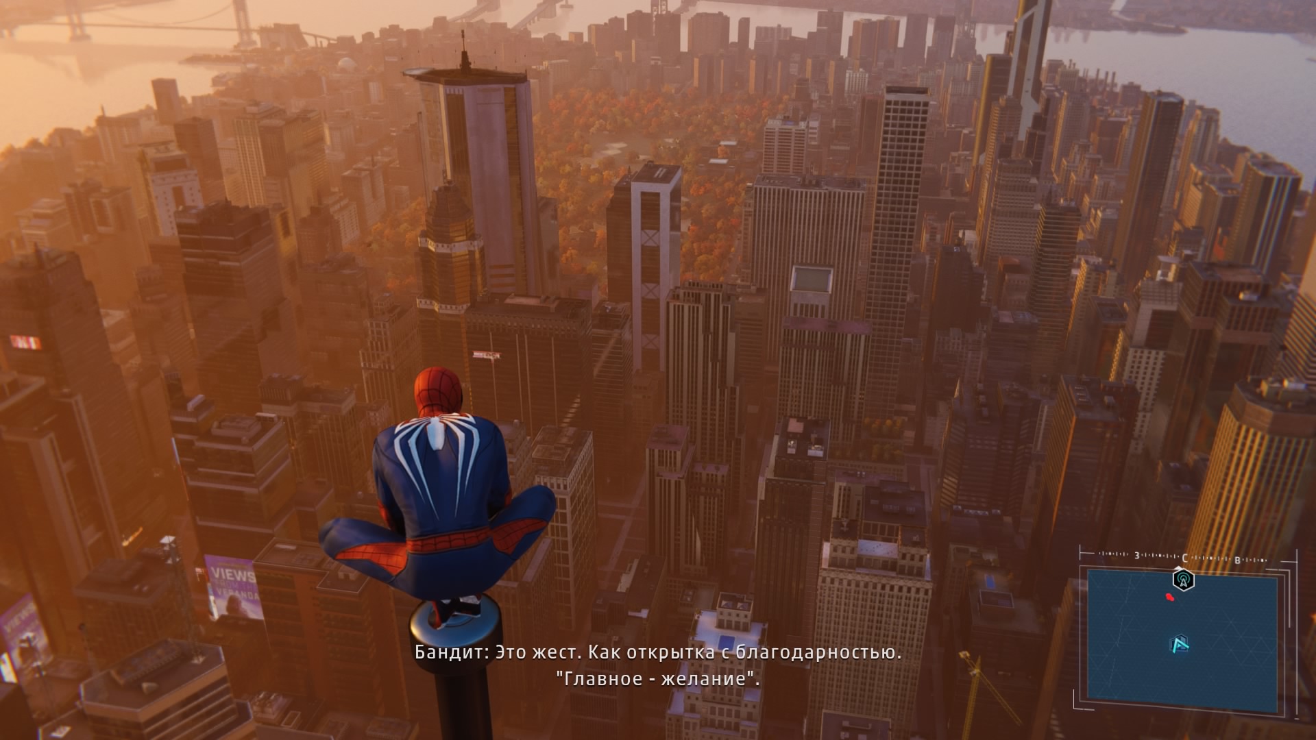 Сам по себе "открытый мир" проработан очень неплохо: перед нами действительно огромный Нью-Йорк с проработанными зданиями, крышами, парками, магазинчиками, которые грабят бандиты, дорожным движением и прохожими, которые не прочь сделать селфи с супергероем. Есть свой Empire State Building и Central Park, которые я благополучно посетил практически первым делом. В целом, смотрится всё правдоподобно, но всё-таки до имитации жизни уровня GTAV всё-таки не дотягивает. Некоторое ощущение "декораций" остаётся. Но основная часть перемещений и активности проходит в верхней части города и про все эти мелочи забываешь. Динамической смены дня и ночи нет: время суток и погода меняются исключительно "по расписанию" сюжетной кампании.