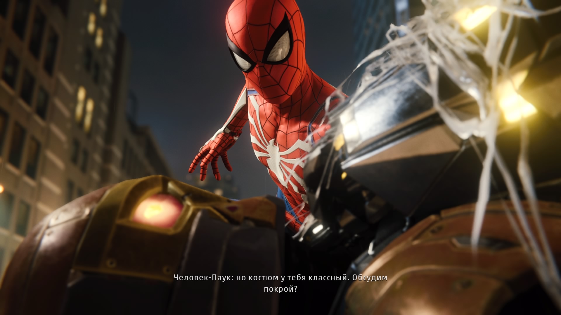 Визуально игра выполнена очень круто. Не идеально, но выглядит действительно максимально приятно. Здания отлично детализированы, крайне радует глаз освещение, в окнах некоторых зданий разработчики даже не поленились сделать интерьер, который можно заметить пролетая мимо на паутине. В целом, смотреть и играть эстетически очень приятно. На Sony PlayStation 4 Slim мы получаем FullHD с HDR и стабильные 30 кадров в секунду. На Pro — 4K. Да, если внимательно присмотреться — придраться есть к чему: некоторые текстуры и модели сделаны излишне простенько (в частности, рядовые прохожие не блещут детализацией), а некоторые текстуры подгружаются поздновато. Плюс анимация персонажей тоже не идеальна. Таких мелочей немного, но найдётся ряд излишне дотошных геймеров, которые выскажутся по этому поводу. Общая же картина отличная, что подчёркивается отличной постановкой и режиссурой, которые делают игру очень зрелищной.