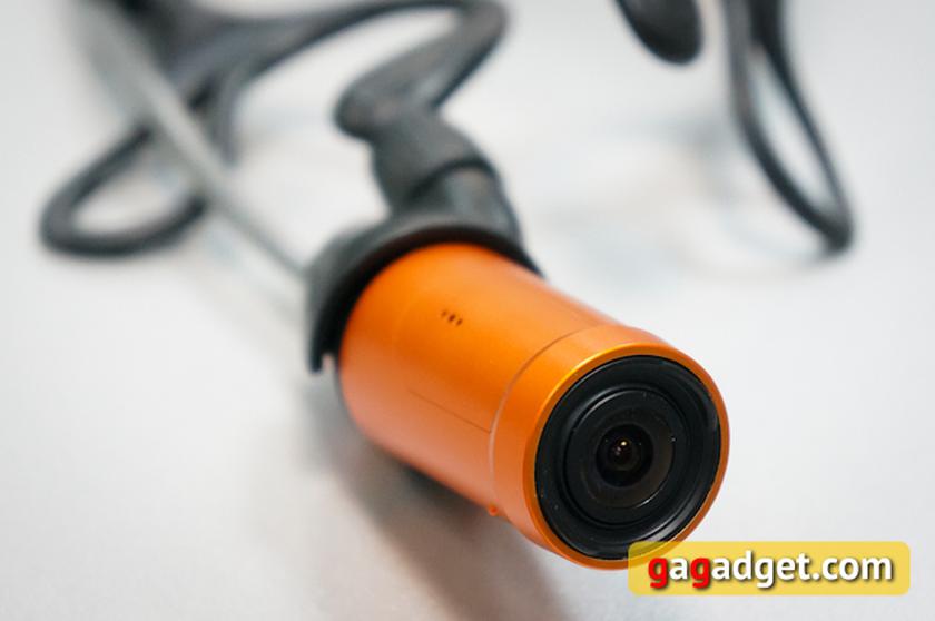На тест досталась камера в веселеньком оранжевом корпусе, судя по сайту производителя есть и более нейтральное черное решение. Теоретически, черная камера должна меньше бросаться в глаза и не так смущать окружающих, практически, вряд ли кто-то не обратит внимание на пятисантиметровый объектив возле уха.