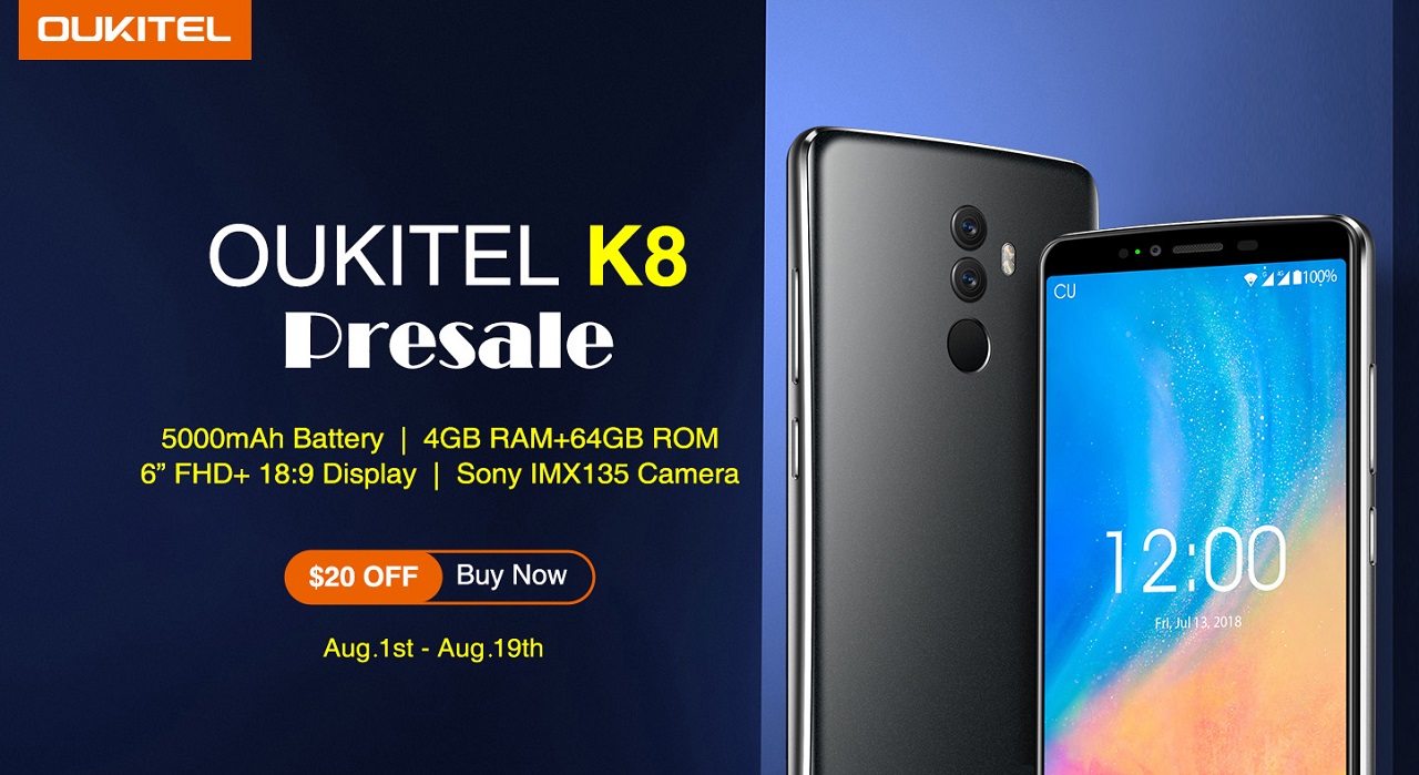 1 августа 2018 года компания OUKITEL начинает предпродажу смартфона OUKITEL K8. Аппарат получил 4 ГБ ОЗУ, 64 ГБ ПЗУ, батарею на 5000 мАч и 6-дюймовый широкоформатный Full HD+ экран. С 1 по 19 августа в магазине AliExpress эту модель можно купить со скидкой 20 долларов США.