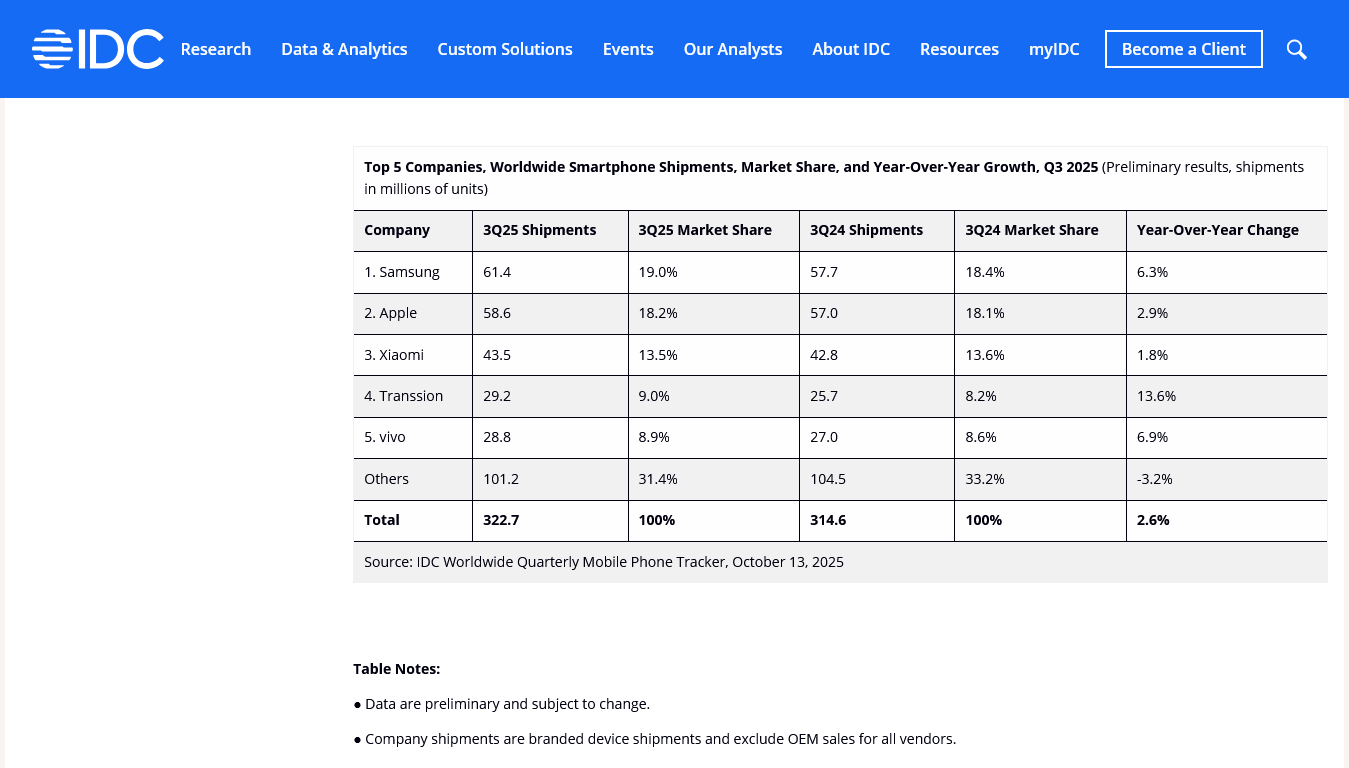 Аналитическая компания IDC выпустила свой очередной отчет, в котором утверждает, что рынок смартфонов продолжает демонстрировать уверенный рост, несмотря на торговую войну и повышение тарифов. Общие поставки смартфонов выросли на 2,6% год к году, до 322,7 млн единиц. Аналитики объясняют рост существенными изменениями на рынке — увеличение аккумуляторов, внедрение AI и развитие новых форм-факторов, прежде всего складных и тонких смартфонов.