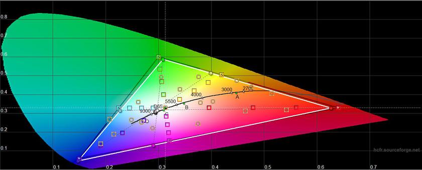 По результатам измерений можно сказать, что экран действительно очень неплохого качества: внушительная максимальная яркость 397.639 кд/м2, яркость чёрного поля — 0.204 кд/м2, и высокий уровень контрастности — 1949:1. Картинка немного уходит в холодные оттенки, цветовая температура не превышает 8000K: