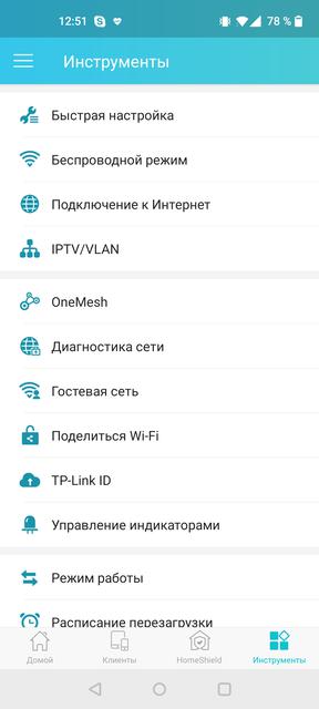 В разделе «Инструменты» собраны классические настройки роутера: управление сетями (включая гостевые) и паролями к ним, IPTV/VLAN, OneMesh, режимом работы и даже световыми индикаторами. Есть функция «поделиться Wi-Fi», которая генерирует QR-код для подключения к сети с другого устройства. Обновление прошивки роутера происходит «по воздуху», это тоже делается прямо из приложения.
