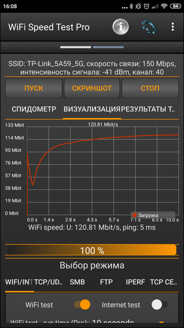 TP-Link Archer C80, как роутер стандарта AC1900, по определению способен развивать скорости до 1300 Мбит/с в диапазоне 5 ГГц и 600 Мбит/с на частоте 2,4 ГГц. Кроме того, все проводные порты — гигабитные. Так что машинка перед нами довольно быстрая. Но я в своей консервативной оценке бытового сетевого оборудования обычно провожу тесты приземлённые, показывающие не такие большие цифры. При тестировании беспроводных сетей со смартфонов приложением Wi-Fi Speed Test мне удалось получить средние результаты в диапазоне 86-112 Мбит/с в зависимости от устройства. Пиковые, разумеется, выше. Более суровый тест — передача 50 мегабайт TCP-пакетов с одного смартфона на другой и обратно. В среднем тут получилось всего 16 Мбит/с в диапазоне 2,4 ГГц и порядка 50 Мбит/с на частоте 5 ГГц. Не смотрите на маленькие цифры, это весьма достойный результат, немного опережающий, например, номинально более быстрые «тарелочки» Deco M9 Plus.