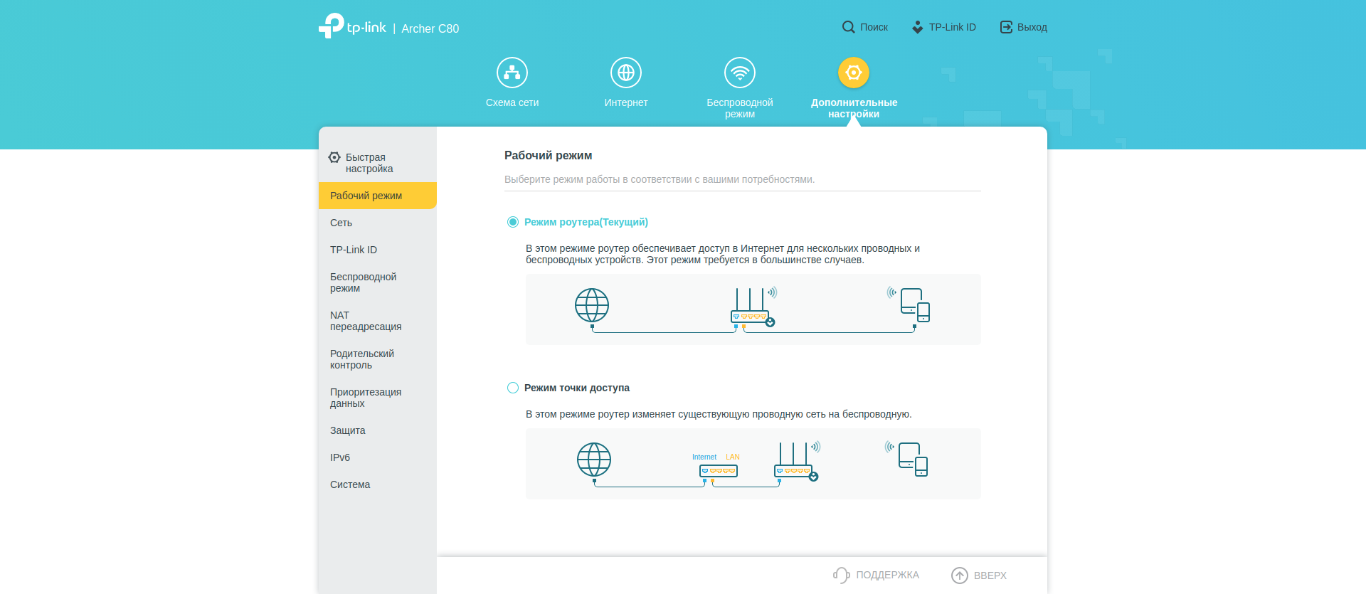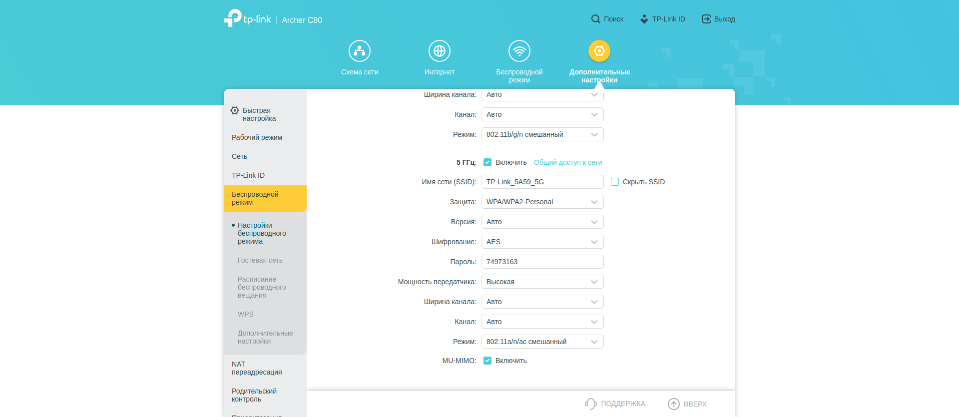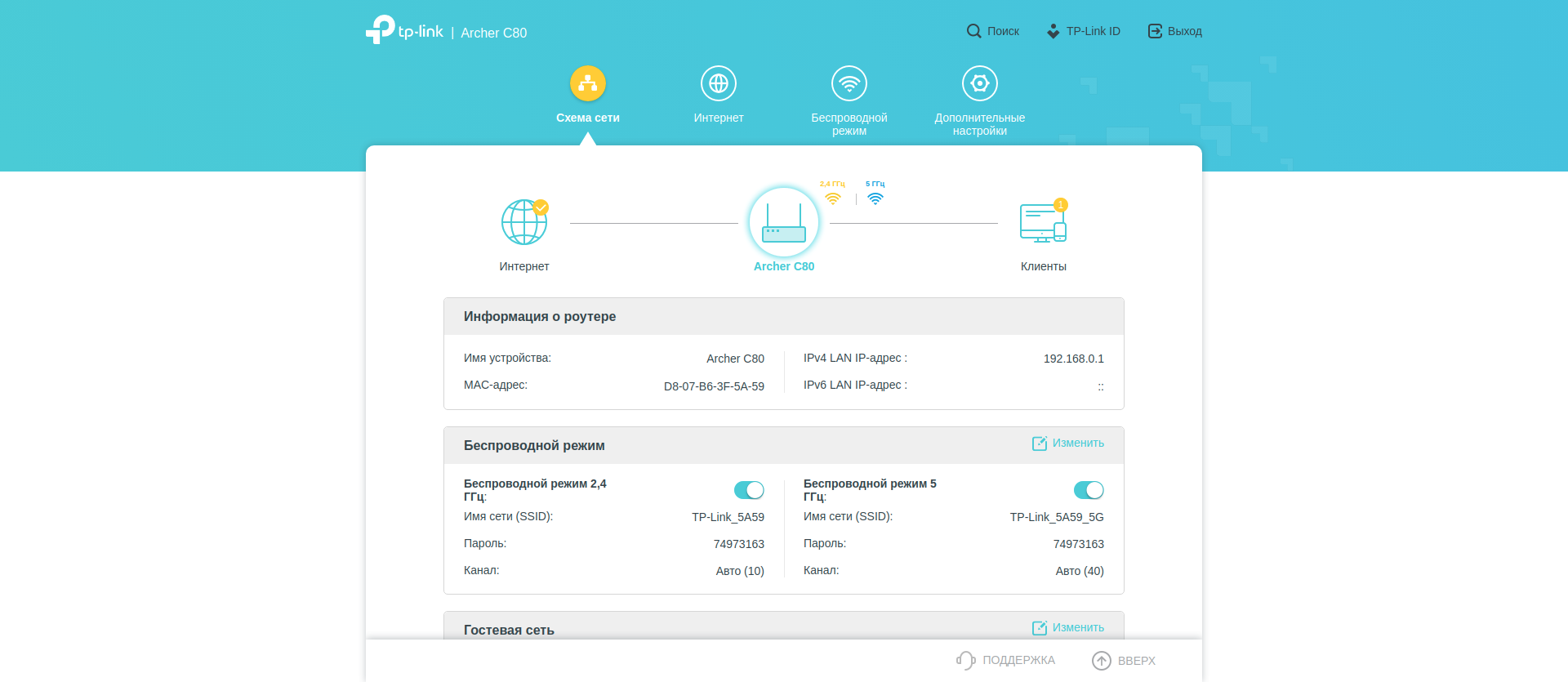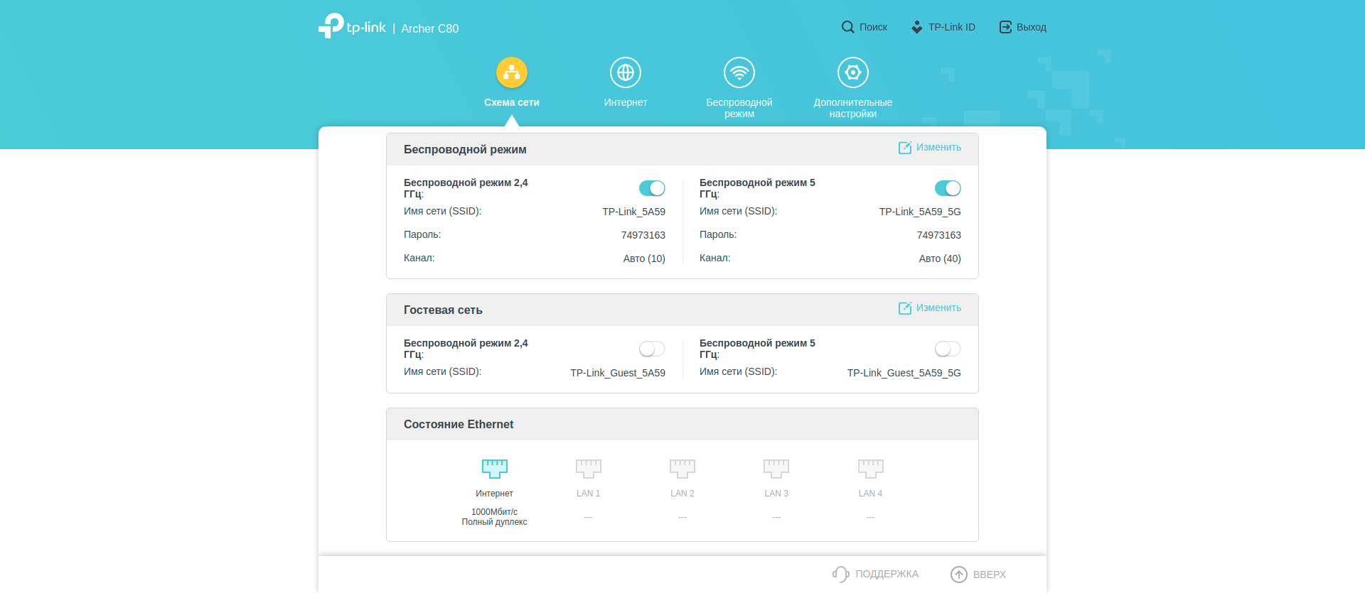 Поскольку настроек много, покажу их всё же с экрана компьютера. Разделы «Схема сети», «Интернет» и «Беспроводной режим» дают нам общее представление о происходящем и в целом повторяют уже выполненные нами настройки.