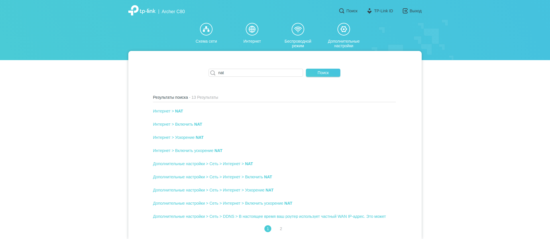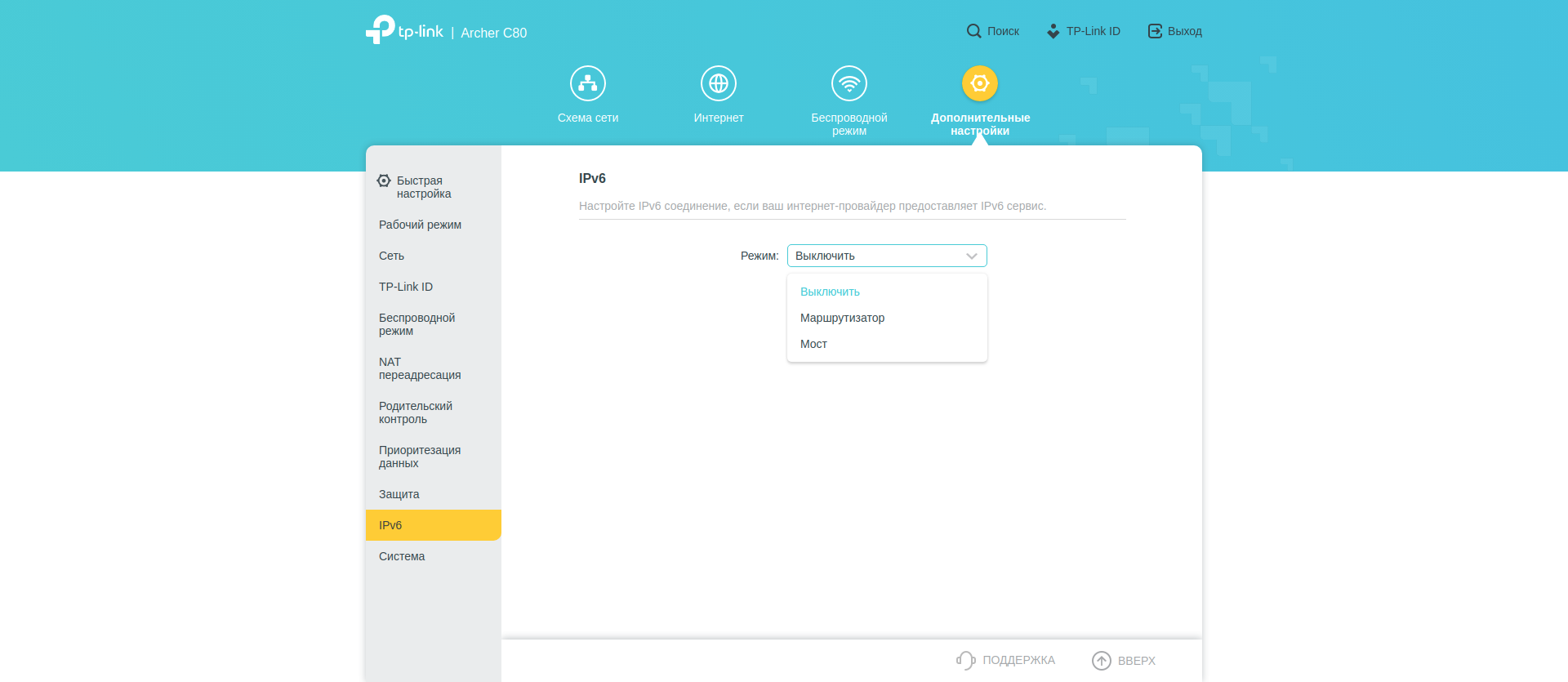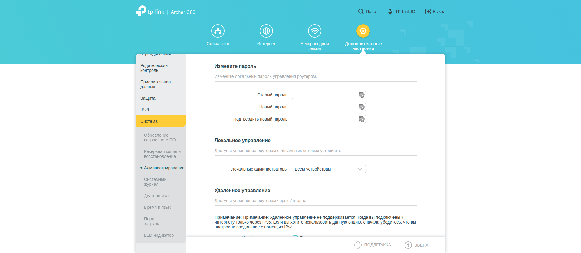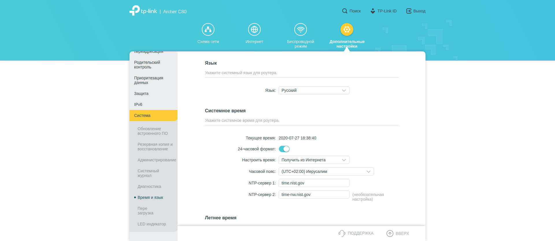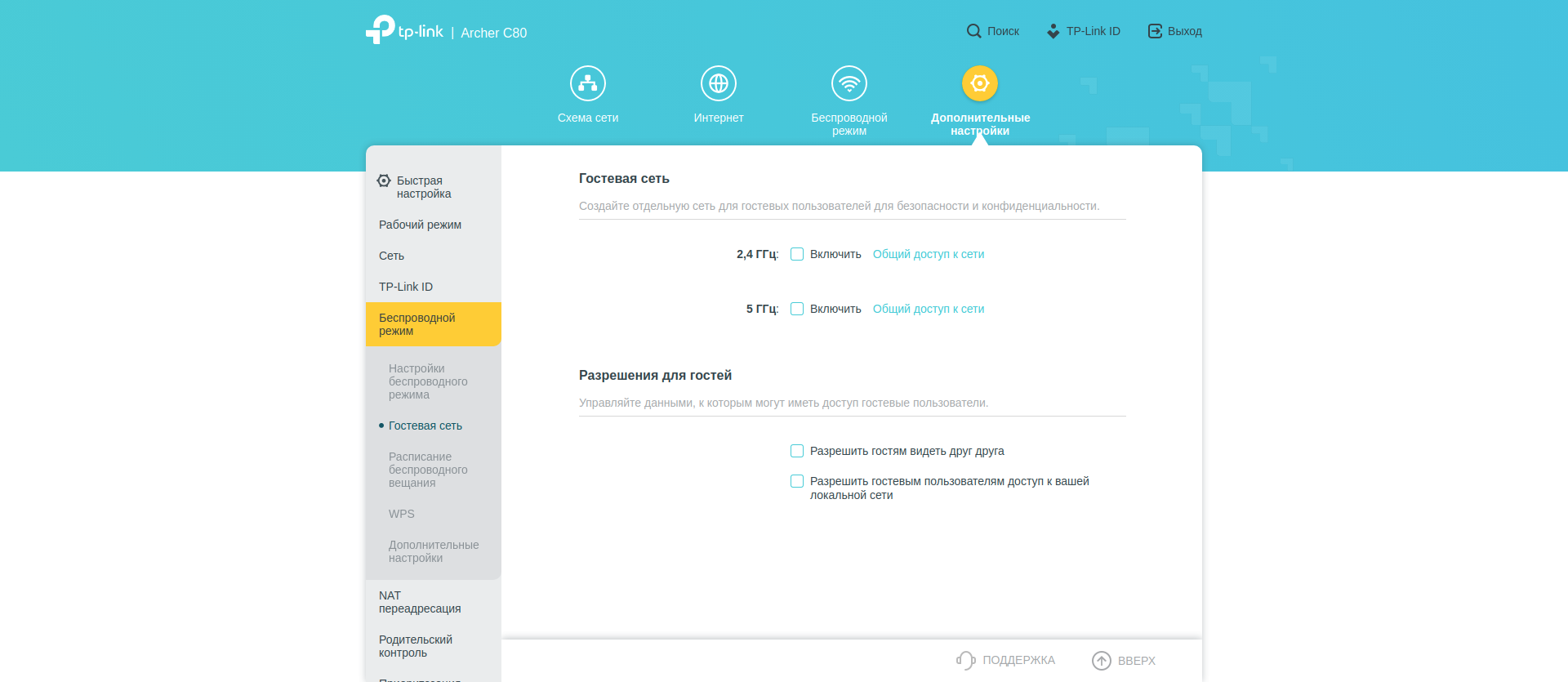 Поскольку настроек много, покажу их всё же с экрана компьютера. Разделы «Схема сети», «Интернет» и «Беспроводной режим» дают нам общее представление о происходящем и в целом повторяют уже выполненные нами настройки.