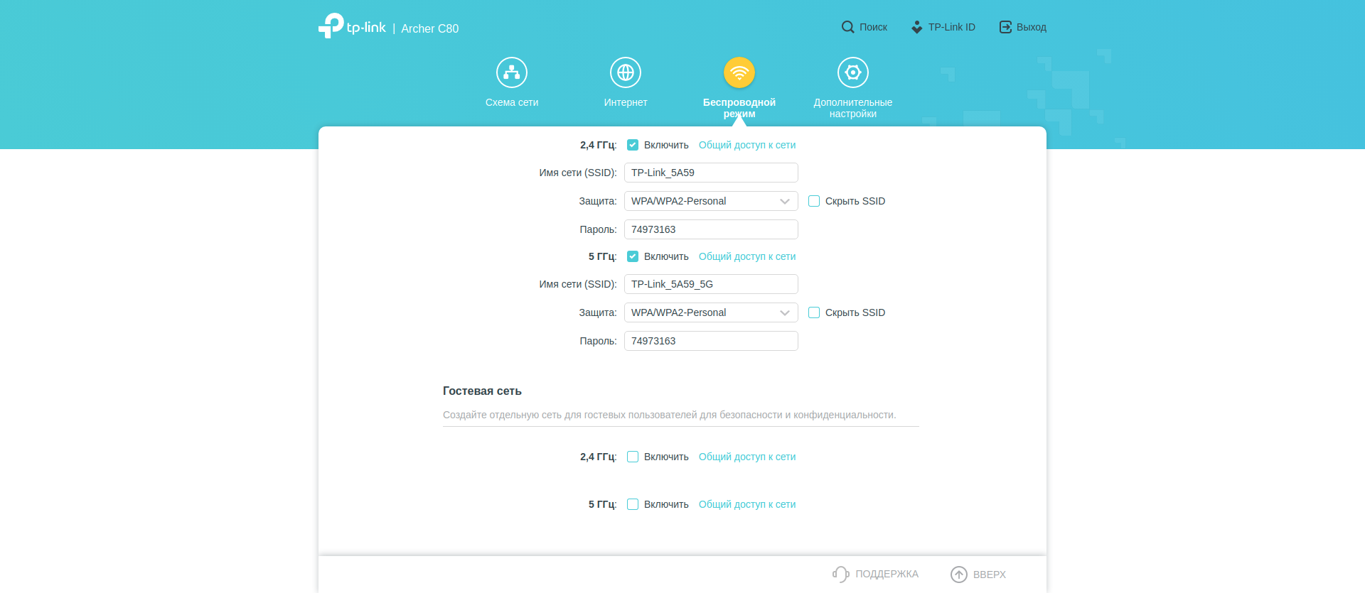 С этого момента у вас уже есть интернет и локальная сеть, осталось только установить своё название для точки доступа и придумать пароль. В случае сброса устройства до заводских настроек будут восстановлены первоначальные названия сетей и пароли (те самые, что на наклейке внизу).