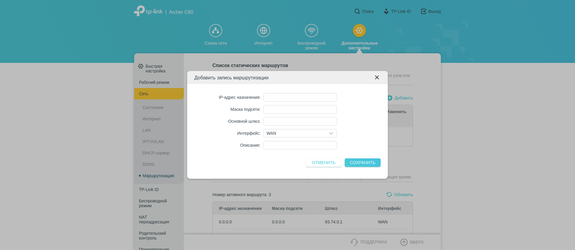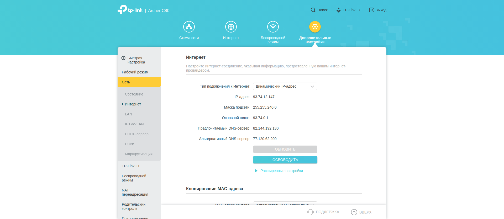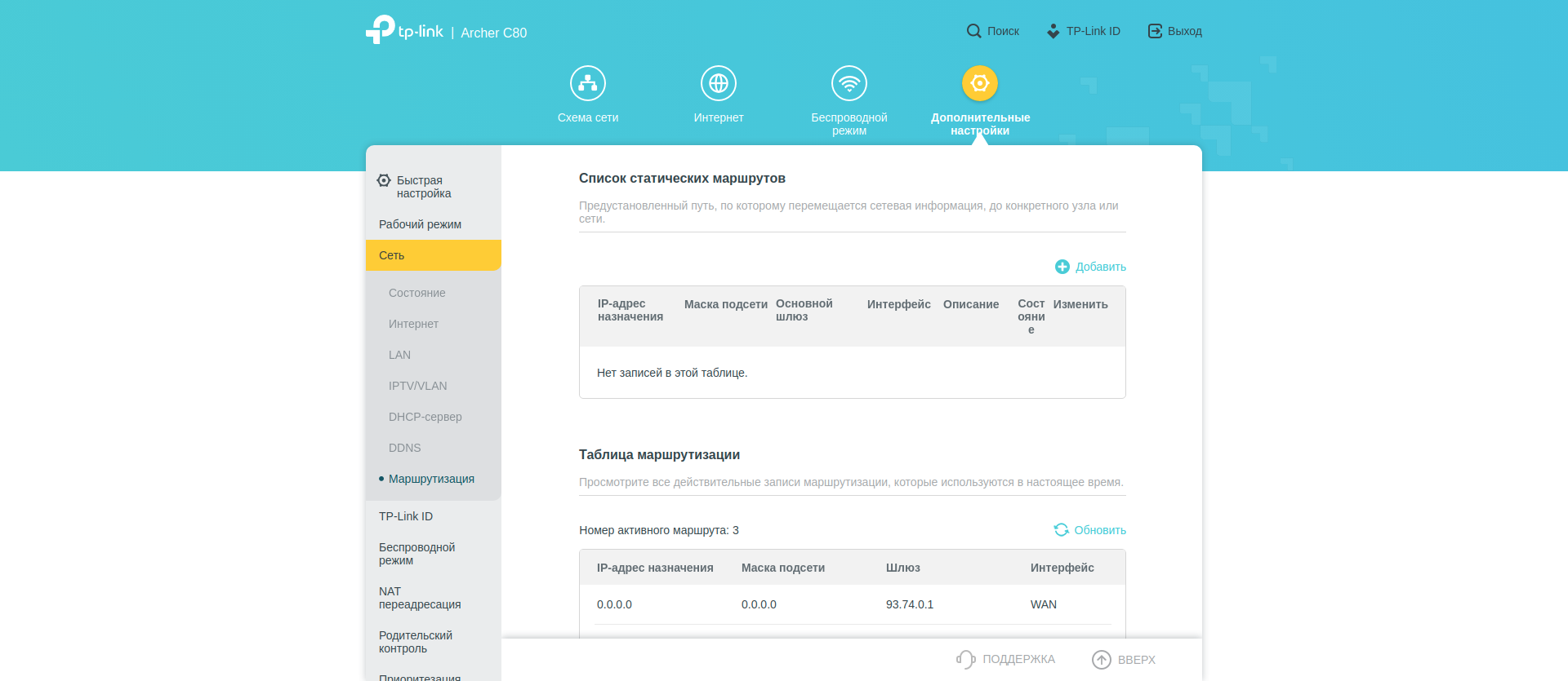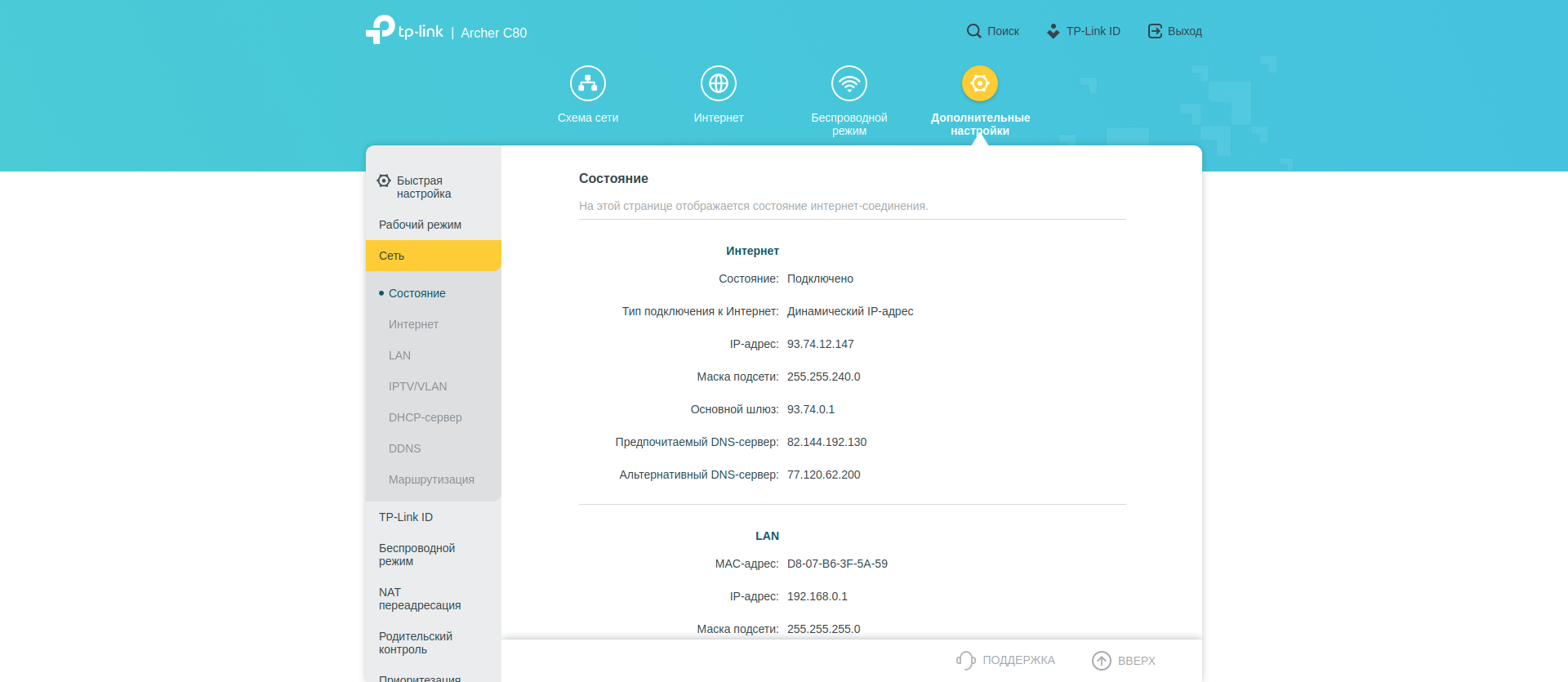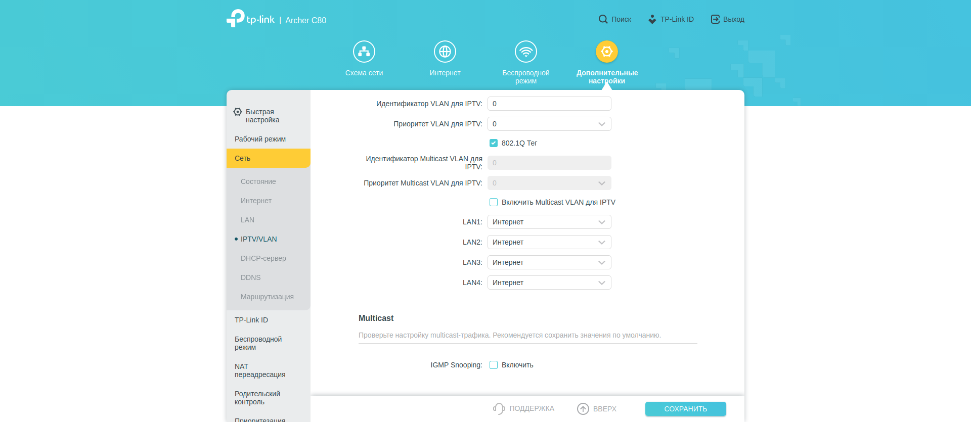 А вот вот в «Дополнительных настройках» собрано всё остальное. В секции «Сеть» — большинство типичных опций: параметры WAN, LAN, DHCP сервера. Тут же можно настроить IPTV. Есть редактирование таблицы маршрутизации.
