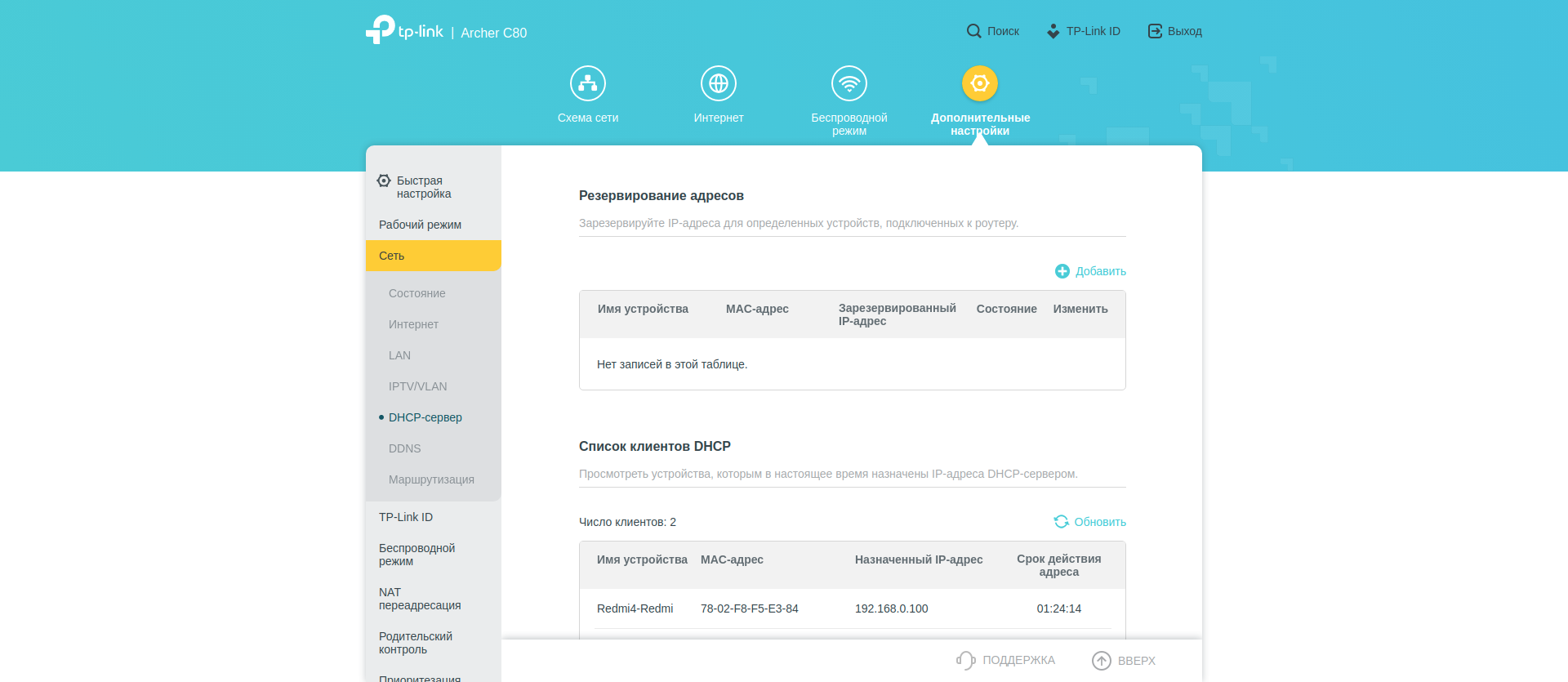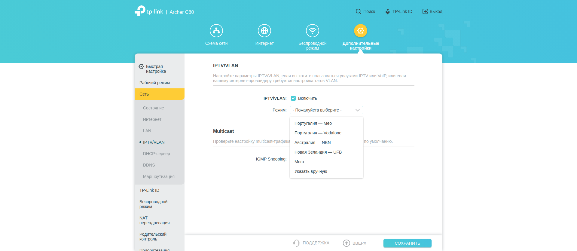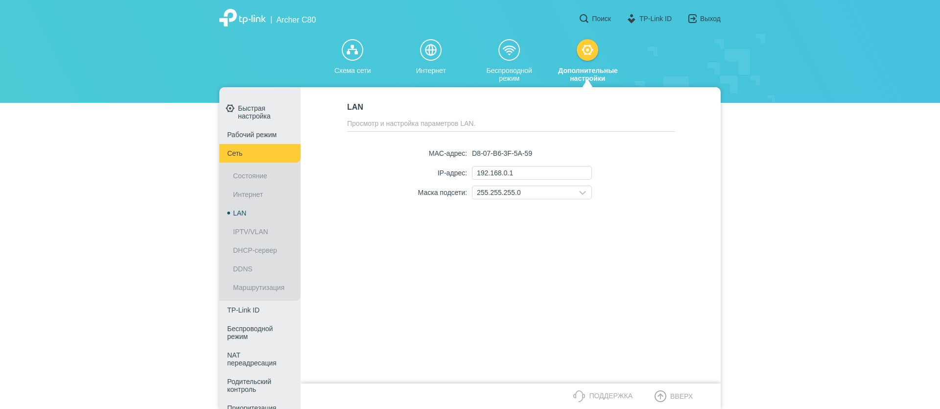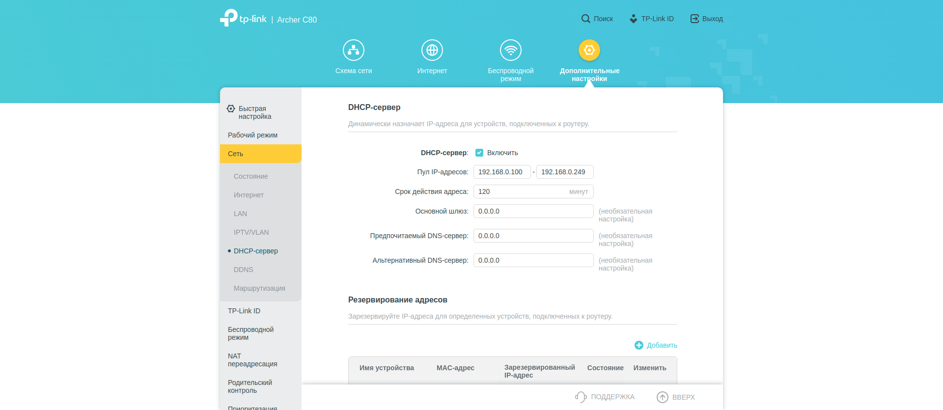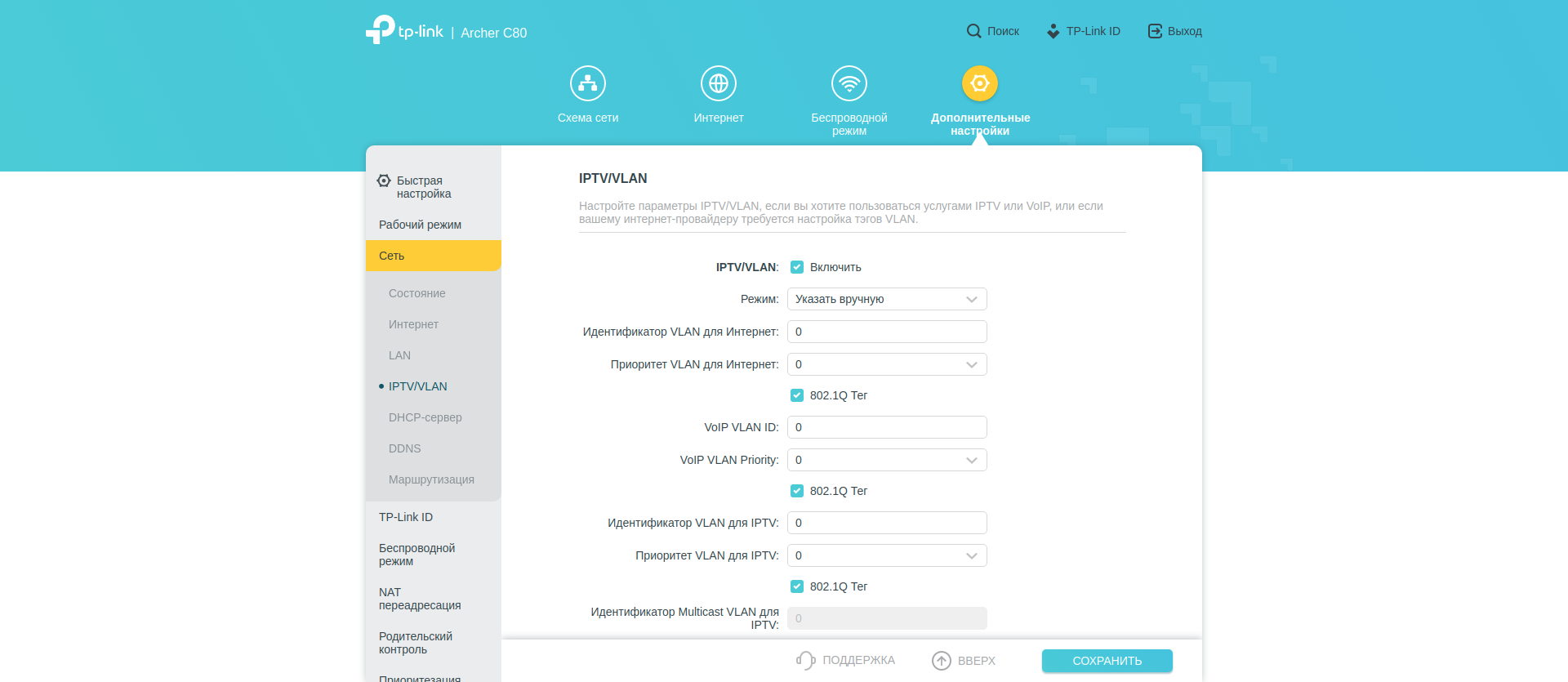 А вот вот в «Дополнительных настройках» собрано всё остальное. В секции «Сеть» — большинство типичных опций: параметры WAN, LAN, DHCP сервера. Тут же можно настроить IPTV. Есть редактирование таблицы маршрутизации.