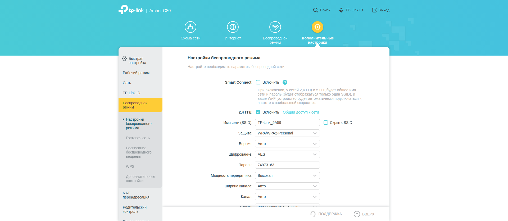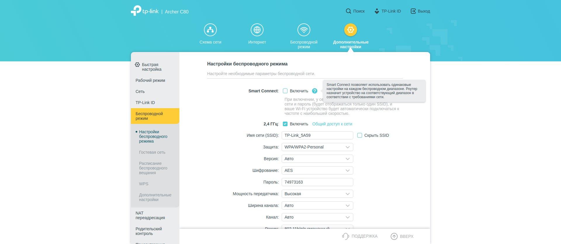 - Smart Connect — умное подключение, при котором у беспроводной сети будет одно название, а оптимальную частоту (2,4 или 5 ггц) и канал роутер будет определять автоматически для каждого конкретного устройства.