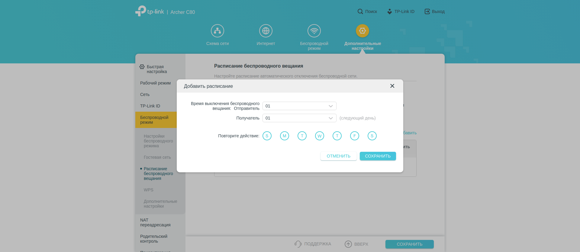 Беспроводной сети посвящен отдельный подраздел. Помимо банальных названия SSID и пароля здесь настраиваются мощность передачи, ширина канала, режим работы и активируется функция Smart Connect, которая объединяет все диапазоны под одним названием. При желании сеть можно сделать скрытой, выключив отображение SSID. Функция MU MIMO активна сразу из коробки. Отдельно настраиваются гостевые сети (для каждого диапазона). Есть настройки WPS и расписания беспроводного вещания (если волны Wi-Fi ночью мешают вам уснуть). Интересно, что функция Aitrime Fairness отключена по умолчанию, тут в «Дополнительных настройках» её можно включить.