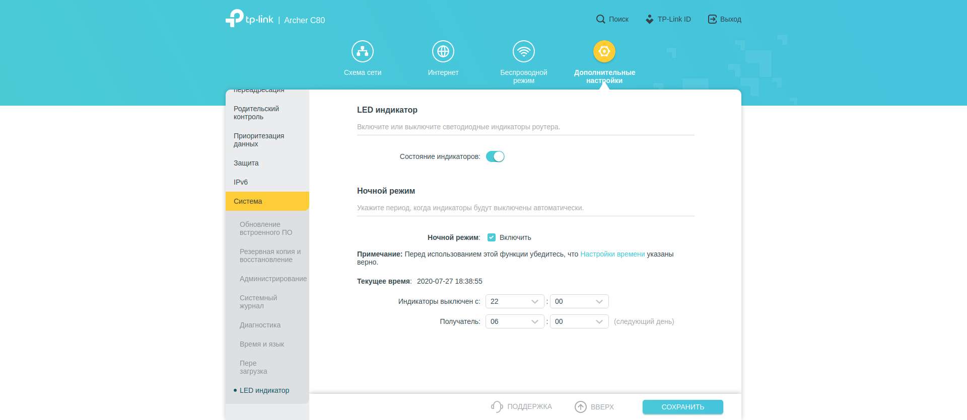В самом конце, как обычно, системные инструменты. Здесь обновляется прошивка устройства. Причем это можно сделать как по воздуху, так и по старинке, из локального файла. Настройки устройства можно сохранить в файл, или же восстановить из ранее сохраненного файла. Изменение пароля, просмотр логов, настройка времени, сброс настроек, перезагрузка и даже настройка светодиодных индикаторов (можно выключить их совсем или по расписанию). Имеются инструменты диагностики: ping и traceroute.