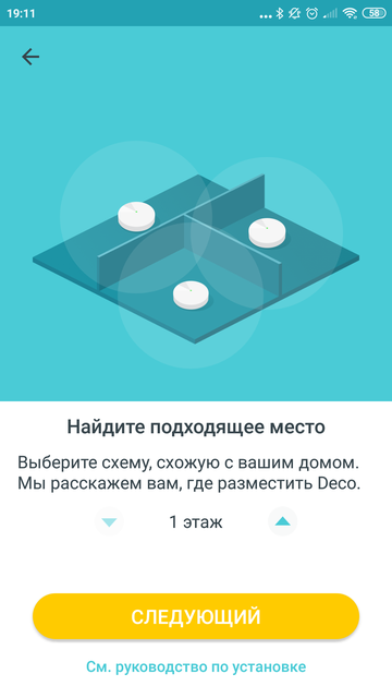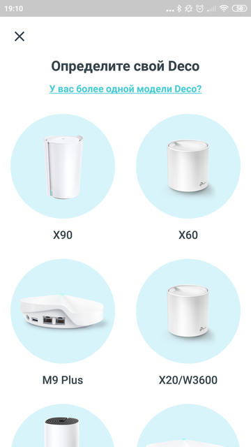 Дальше следуем инструкциям на экране. Нам предложат выбрать из списка нашу модель устройства и по шагам расскажут, что куда включить. Если кратко, то в одно их гнёзд Ethernet на одном из устройств нужно включить интернет-кабель, а блок питания устройства Deco — в розетку. И скорее всего всё заработает. Хотя пошаговая инструкция немного перегибает с подробностями и предлагает подключаться через существующий роутер. В общем, если вы сделаете всё по инструкции, то система точно будет работать, но если, подобно опытному самураю, срежете путь, то с большой вероятностью получите тот же результат.