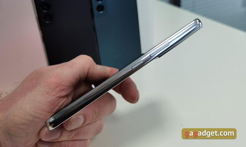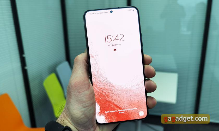 Задня ж кришка, а точніше реалізація тильної камери мені нагадала торішній недорогий Galaxy A32: п'ять круглих об'єктів, що окремо стирчать приблизно на міліметр над корпусом смартфона, скажімо так. Торішнє рішення у Galaxy S21 Ultra все ж виглядало якось практичніше, хоча це вже смаківщина. Усі чотири колірні варіанти матові, ніякого глянцю. Цього року всі кольори вийшли по-своєму цікавими. Окрім стандартних чорного та білого, є менш звичний темно-зелений та шикарний бордовий (він же Burgundy).