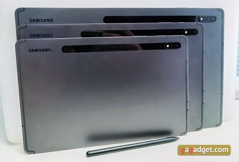 Нових флагманських планшетів цього року аж три. Найважливіша відмінність між ними — розмір, роздільна здатність і тип екрана. Всі три моделі великі: найменша діагональ – 11 дюймів. В іншому - схожий дизайн, металевий тонкий корпус, підтримка мобільних мереж, S Pen (і кріплення його магнітом до задньої панелі) і чотири динаміки з підтримкою Dolby Atmos. Детальні характеристики: