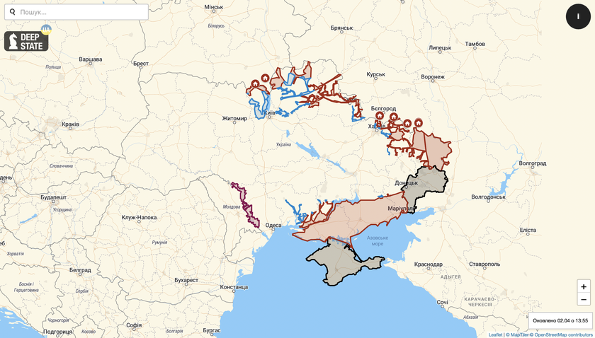 В Україні запустили сайт DeepStateMap з картою війни, яка оновлюється в режимі реального часу. На карті є червоні, сині та чорні ділянки. У першому випадку, це тимчасово окуповані рашистами території з початку повномасштабного вторгнення 24 лютого. У другому — місця, в яких ЗСУ вибили окупанта. Чорним кольором позначені території, які росія окупувала у 2014 році (Крим, частина Донецької та Луганської областей).