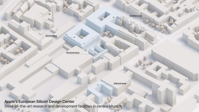 Дослідницький центр буде побудовано на Зайдльштрассе в Мюнхені. Крім того, фахівці Apple займуть кілька приміщень на сусідніх вулицях Денісштрассе і Марсштрассе. Усі три об'єкти будуть розташовані поруч із науково-дослідним центром компанії на Карлштрассе. Разом із двома інженерними майданчиками вони утворюють European Silicon Design Center у центрі Мюнхена.