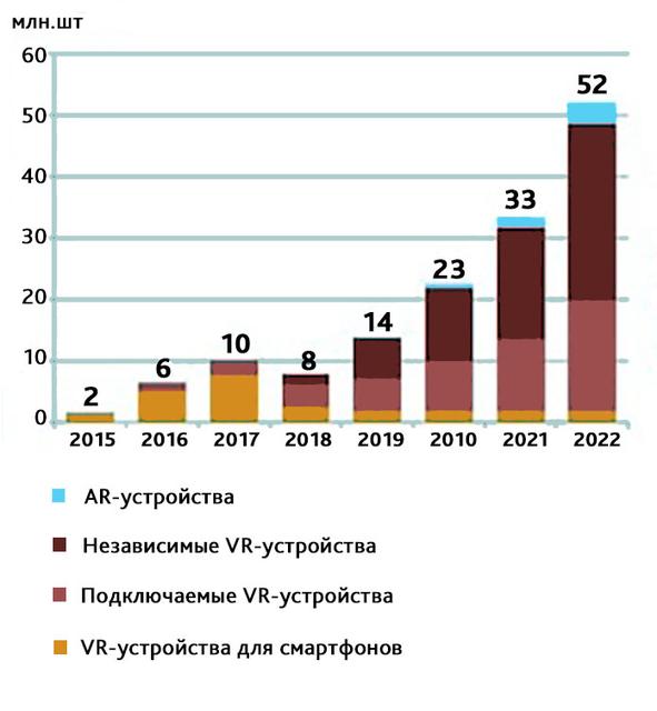За прогнозом IDC, в 2019 році очікується, що буде відвантажено 8,9 млн VR/AR-гарнітур, на 54,1% більше, ніж роком раніше. Для порівняння, у 2018 році IDC нарахувала 172 млн відвантажених одиниць смарт-годинників (і ці цифри все ще не дають назвати технологію масовою), смартфонів - майже в 10 разів більше. У торішньому звіті аналітики IDC припустили, в 2022 році кількість відвантажених VR-шоломів складе 68,9 млн, а за даними на березень 2019 (підсумки 2018) - приблизно вдвічі менша до 2023.