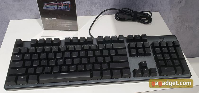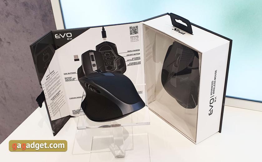 З цікавих ігрових моделей на стенді компанії була миша Trust EVO RX. Це модель з оптичним сенсором та трьома варіантами підключення. EVO RX може працювати по кабелю (використовується USB Type-C), по радіоканалу з USB-донглом або через Bluetooth. Миша велика і важка, форма асиметрична та розрахована виключно під праву руку. З цікавих особливостей є додаткове колесо прокрутки під великий палець.