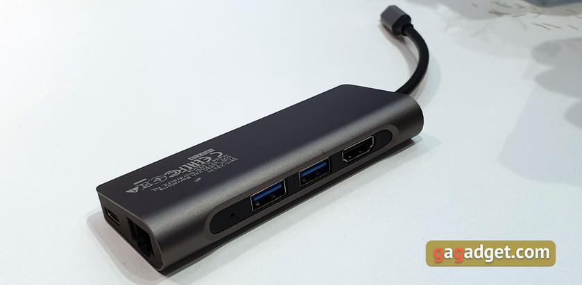З корисних дрібниць на стенді був новий Type-C док 7 в 1. Для підключення до ноутбука використовується USB 3.2 Gen 1 зі швидкістю до 5 Гбіт/с. Є слоти для карт пам'яті SD, MicroSD, Gigabit Ethernet, USB-C PD для зарядки ноутбука потужністю до 60 Вт, 2 порти USB 3 та HDMI. В Україні буде доступний за 1000 грн у листопаді: