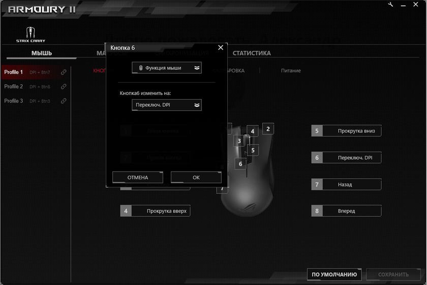 У мишці передбачена пам'ять для збереження трьох профілів, які можна один раз налаштувати за допомогою фірмового ПЗ, після чого воно і не знадобиться. Перемикання профілів відбувається натисненням кнопки перемикання DPI + бічні кнопки або натискання на колесо прокрутки. Мишка ASUS ROG Strix Carry налаштовується за допомогою фірмового ПО ROG Armoury II. Воно є універсальним для всієї ігрової периферії ASUS. У верхній частині є чотири основні вкладки. Перша (з назвою Миша) і відповідає за всі налаштування, які також розділені на групи. Збоку - можна побачити різні режими і комбінації для їх активації. У першій вкладці можна перепризначити дії кнопок: