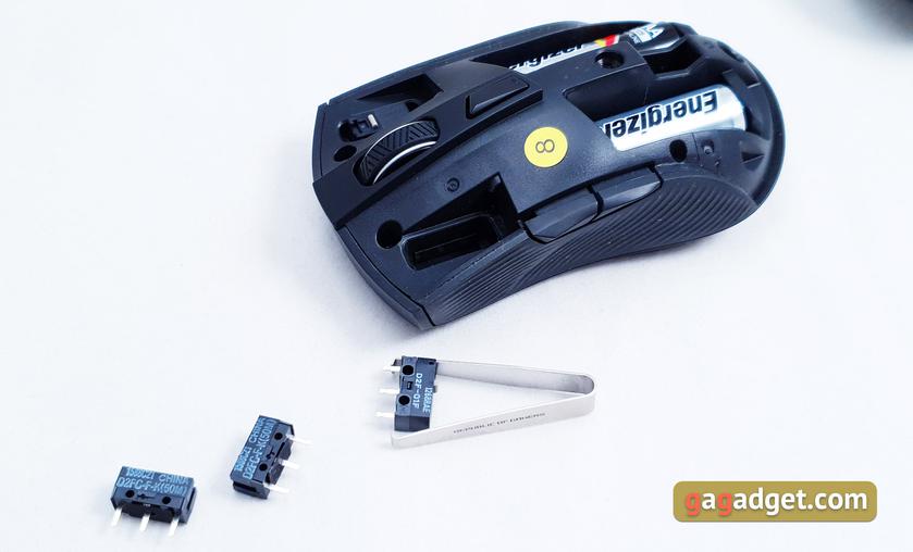В основних кнопках використовуються якісні перемикачі Omron. За замовчуванням встановлені китайські Omron D2FC-FK (50M) на 50 млн натиснень. Вони володіють швидким, легким та інформативним ходом. Вони дуже швидкісні та відмінно підходять для шутерів. У комплекті є ще пара японських Omron D2F-01F з більш тугим ходом та ресурсом 1 млн спрацьовувань. Заміна відбувається дуже легко за допомогою комплектного "пінцета". А якщо вам вдасться "вбити" обидва комплекти, то миша сумісна з перемикачами Omron серій D2F та D2FC: