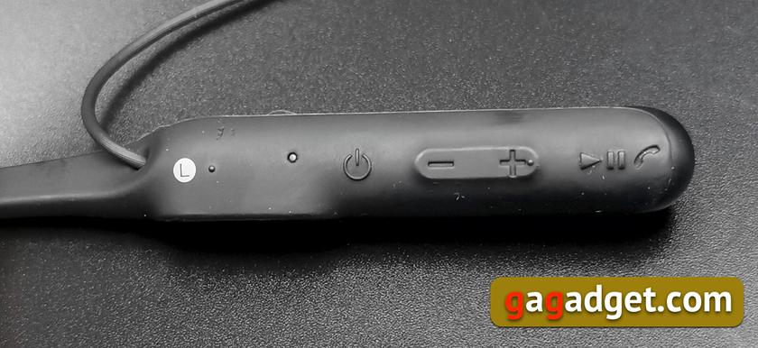Найголовніші органи управління розміщені на лівій частині «коміра». На вигляд все просто і зрозуміло - кнопка живлення, клавіша-гойдалка для регулювання гучності і універсальна кнопка, яка використовується для відповіді на дзвінок, відтворення музики, паузи і перемотування (подвійне натискання - наступна композиція, потрійне - попередня). Дивно, але саме управління викликало у мене роздратування. Незважаючи на те, що кнопки всі опуклі, і, по ідеї, повинні легко намацуватися, щоб працювати «наосліп», на практиці намацати кнопку живлення вночі, коли ти вирішив подивитися в ліжку пару свіжих серій на ноутбуці, було нетривіальним завданням. Все виходило тільки з третього разу, нагадуючи відомий анекдот про підключення з третього разу USB-флешки «правильною» стороною. У підсумку краще було включати гарнітуру заздалегідь, і тільки потім надягати на шию. З гучністю і перемиканням композицій таких проблем не виникало - гойдалку простіше намацати, вона крупніша, а кнопка відповіді на дзвінок знаходиться біля краю корпусу. Але натискати тричі кнопку для повтору пісні - все ж не найкраще рішення. Хоча у тих, хто ніколи не користується перемотуванням, проблем бути не повинно.