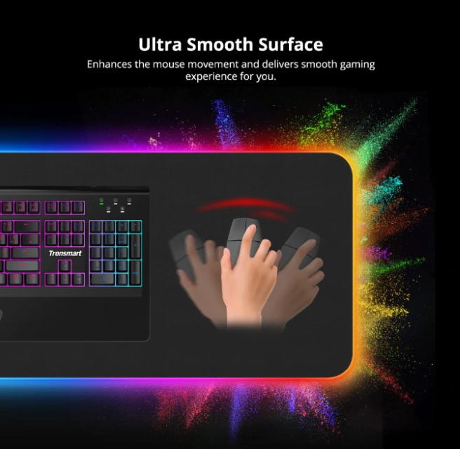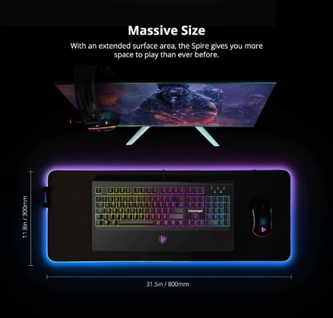 Tronsmart Spire - це килимок для геймерів із RGB-підсвічуванням. Його колір можна міняти, натиснувши кнопку на пульті. На вибір є 10 варіантів. Килимок також отримав текстуроване покриття із захистом від води та немаленькі габарити: 800×300×4.0 мм. За словами виробника, Tronsmart Spire також покращує рух миші та забезпечує плавний ігровий досвід.