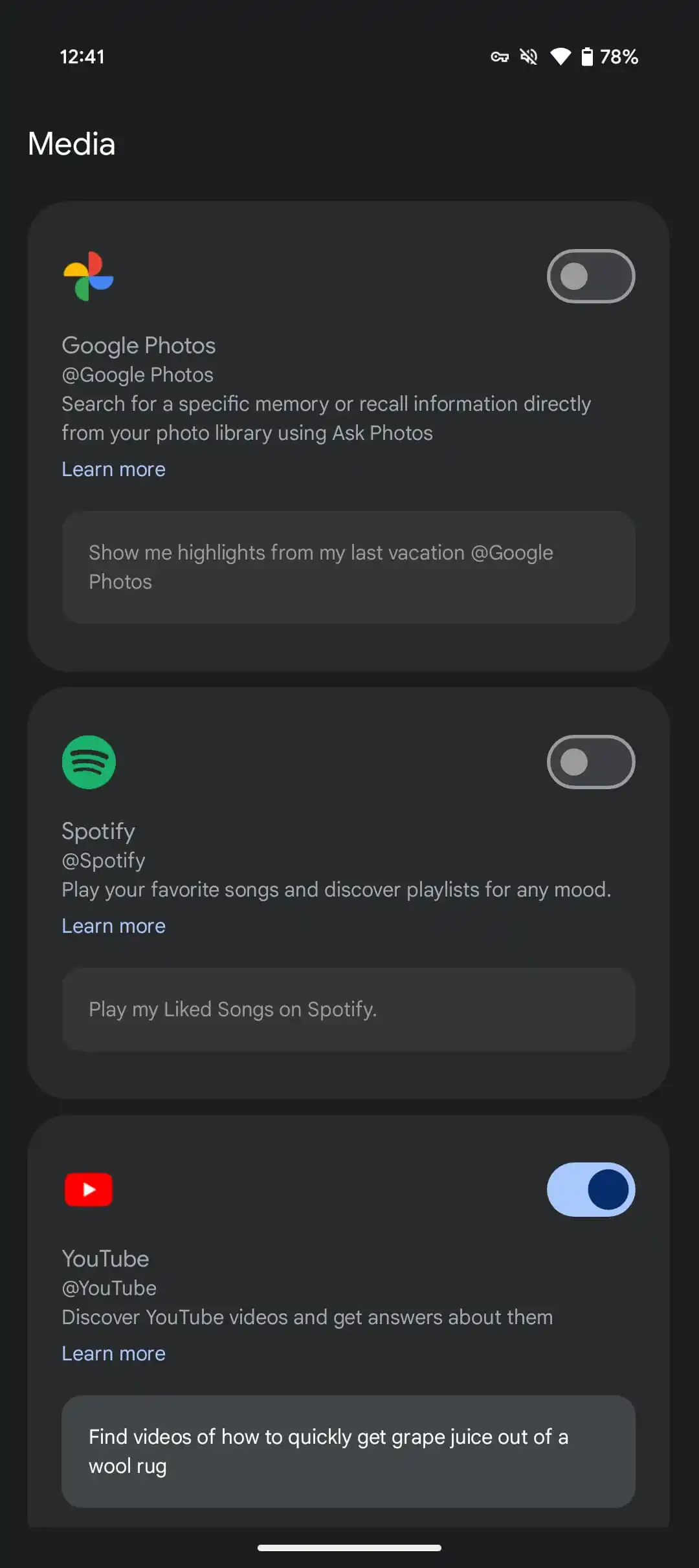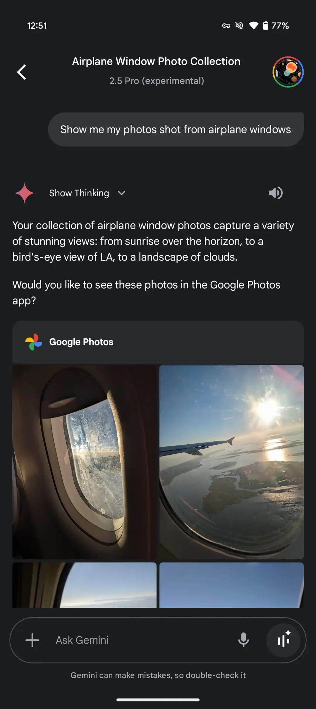 Ця інтеграція складається з двох ключових компонентів. Перший дає змогу користувачам шукати резервні копії зображень і відео, ґрунтуючись на групах осіб або стосунках, збережених у Google Фото, місці або даті зйомки, описі вмісту зображення, а також поточній розмові з додатком Gemini.