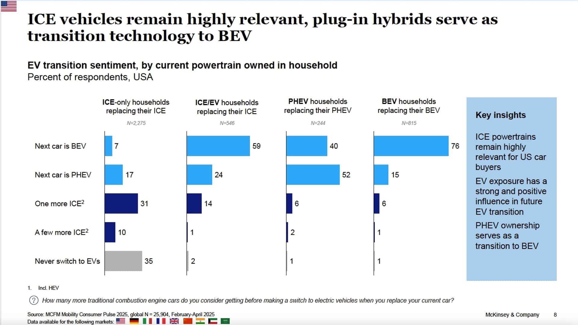 McKinsey опитала 26 000 осіб у ключових регіонах світу, по 3 000 у кожній великій країні, включно з 1 000 власників електромобілів і 2 000 власників машин із ДВЗ. Лише 12% опитаних у США планують купити електромобіль наступного разу - проти 23% у Європі та 45% у Китаї. 32% американців заявили, що ніколи не розглянуть купівлю електромобіля. У Китаї так відповіли лише 3%. Там грають роль десятиліття субсидій, дешевші моделі та розвинена зарядна мережа. Крім того, багато китайських покупців або ніколи не володіли автомобілями з ДВЗ, або мали тільки один такий досвід до переходу на електромобілі.