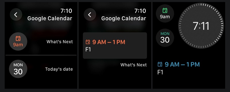 "Календар" став четвертим додатком від Google для watchOS і пропонує зручний інтерфейс: події відображаються у вигляді карток із кольоровим маркуванням, зазначенням часу, назви та місця розташування зустрічі. Також доступний тижневий огляд і список поточних дат у правому верхньому куті екрана.