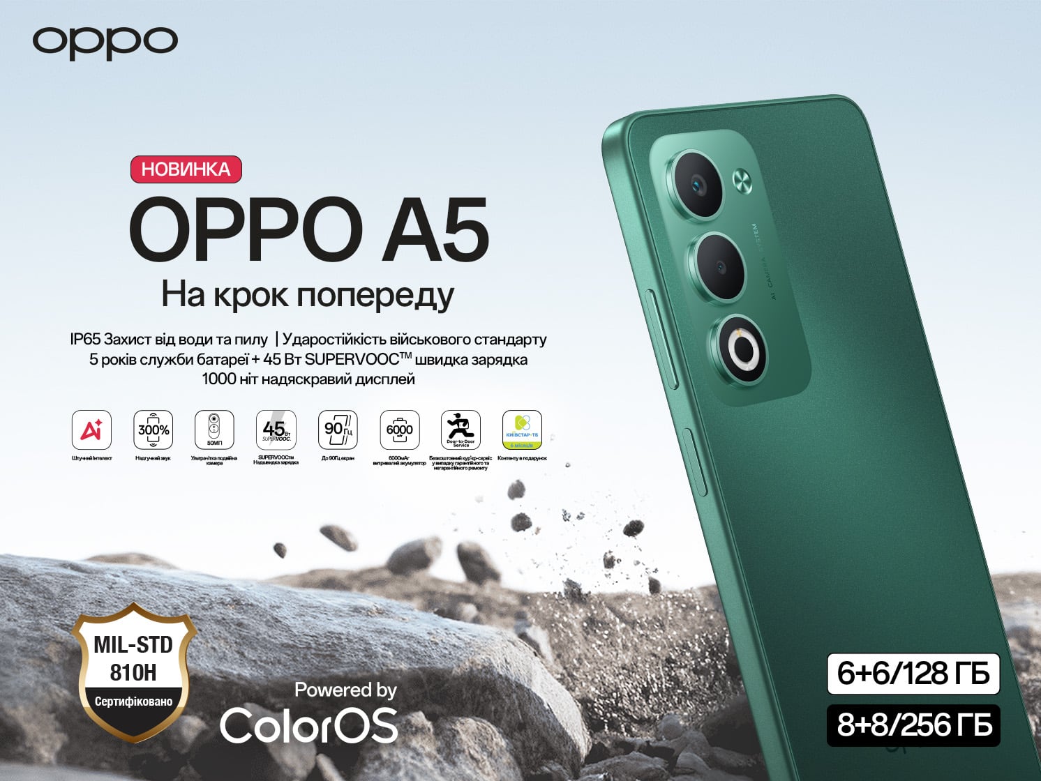 Компанія OPPO AED Україна презентувала одразу дві новинки серії А5 — моделі A5x (4/128 ГБ) та A5 у комплектаціях 6/128 ГБ та 8/256 ГБ. Смартфони створені для користувачів, яким потрібна витривалість, автономність і розумна ціна в одному корпусі. Головні фішки: батарея на 6000 мА·год із 5-річною гарантією ємності, захист від пилу й води IP65 та (цитата) "міцність військового стандарту".