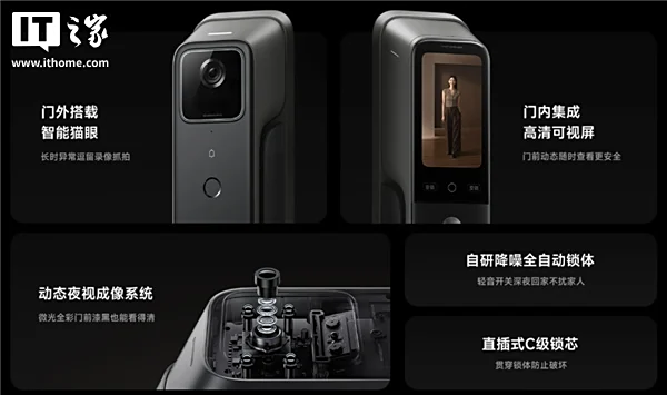 Це дверний замок, але оснащений найсучаснішими технологіями. Він може розпізнавати власника по візерунку капілярів на долоні, 3D-скануванням обличчя, розпізнаванням відбитку пальця, паролем чи дистанційно через телефон або годинник. А ще можна вставити NFC-карту, як в готелях. Додатково камера записує відео, якщо хтось знаходиться біля дверей. Замок обладнаний системою кольорового нічного бачення, 24 ГГц радаром і штучним інтелектом для розпізнавання підозрілих людей. Замок відправляє повідомлення тривоги, якщо його намагаються відкрити силою. Штучний інтелект намагається розпізнати підозрілі паттерни поведінки і відправить сигнал тривоги навіть якщо зловмисник до нього навіть не доторкнувся. За заявою виробника, система проводить розпізнавання менше, ніж за секунду, а кількість помилок розпізнавання ШІ не перевищує 1%.