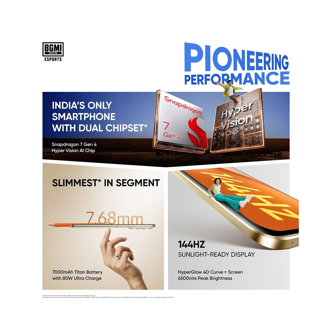 HyperVision AI — це чип власної розробки, створений на базі візуального процесора Pixelworks X7 Gen 2. Цей допоміжний субпроцесор, який займається обробкою готової графіки, наприклад, збільшує частоту кадрів і покращує роздільну здатність за допомогою штучного інтелекту. За словами Realme, цей помічник дозволяє Snapdragon 7 Gen 4 досягти рівнів продуктивності, порівнянних з чипсетами вищого рівня.