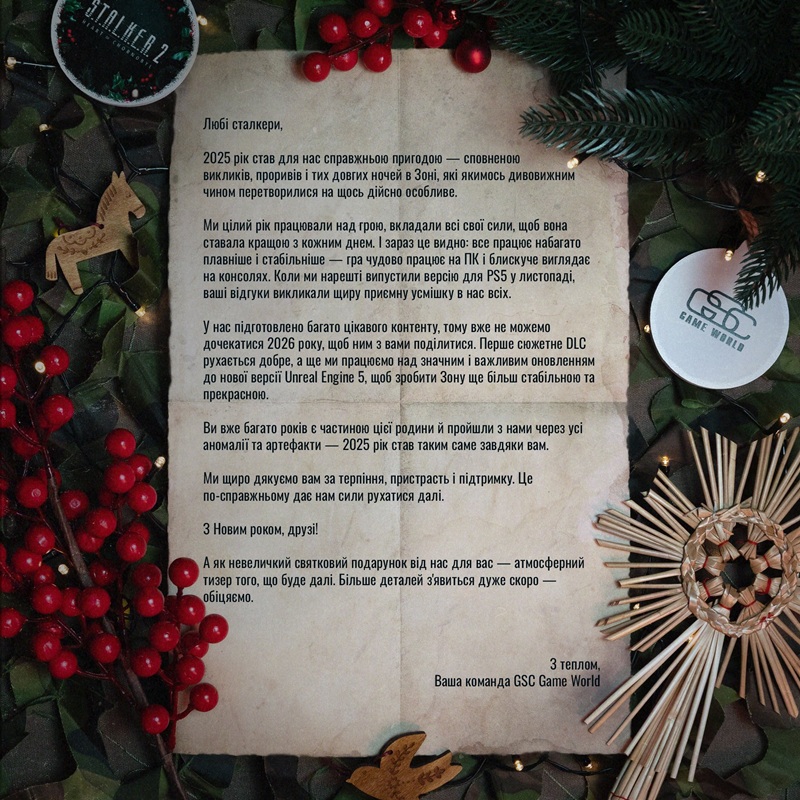 Українська студія GSC Game World привітала вірних фанатів франшизи S.T.A.L.K.E.R. з Новим роком та підготувала для них невеликий подарунок — тизер першого DLC для Heart of Chornobyl.