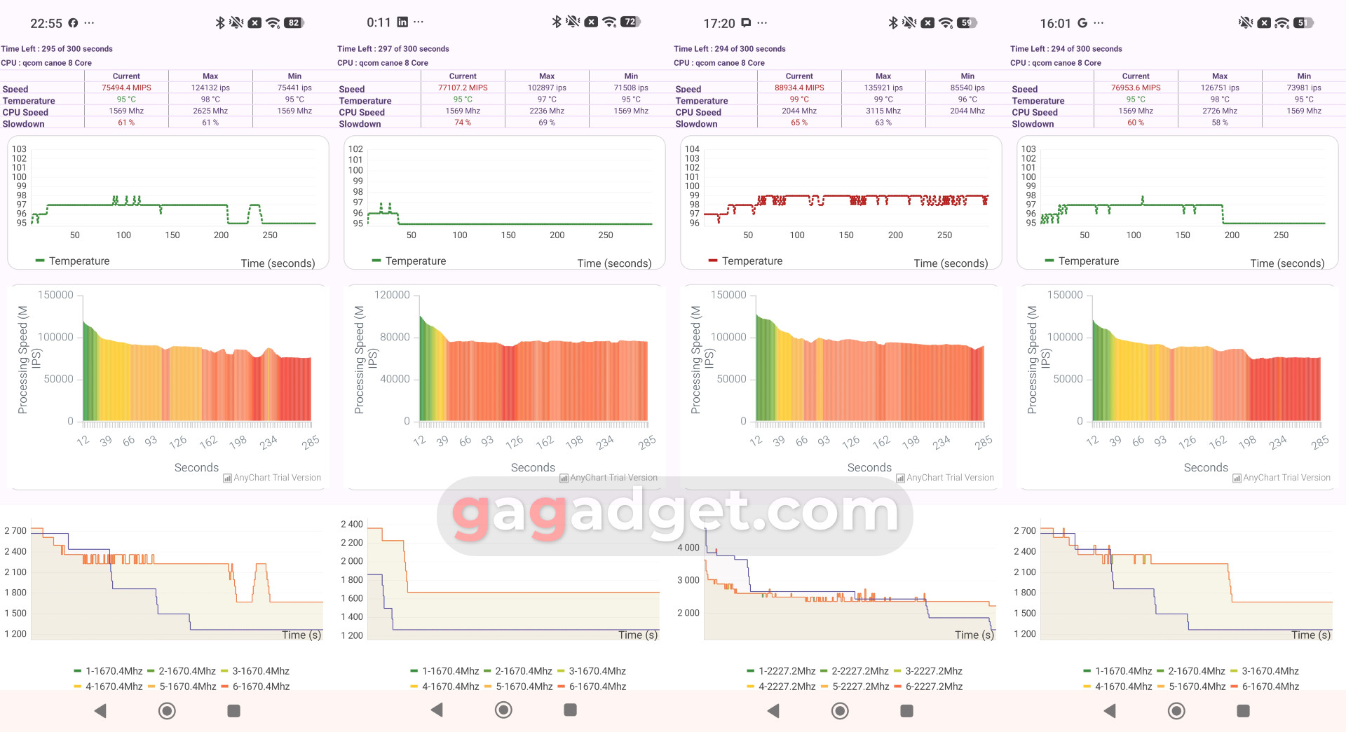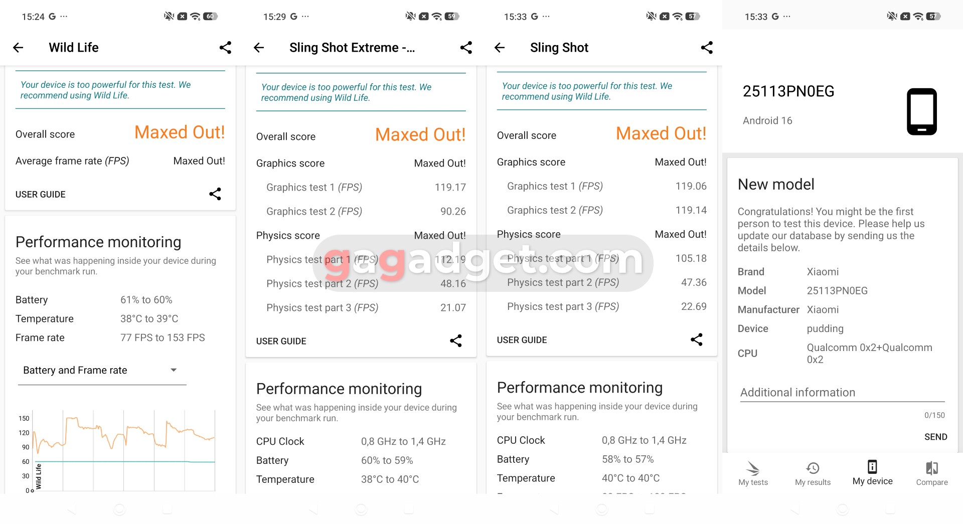Так заради неї ви ж такий смартфон і купуєте! Лінійка Xiaomi 17 побудована на базі Qualcomm Snapdragon 8 Elite Gen 5. Це найсучасніший процесор з восьми ядер Oryon V3, частота яких може сягати 4,6 ГГц. За графіку відповідає прискорювач Adreno 840, ну і на додачу нам підвезли підтримку надшвидкої пам'яті LPDDR5X та накопичувачів UFS 4.1. Апарат має просто розривати бенчмарки, що він в деяких випадках і робить буквально, як-от у тестах SlingShot та Wild Life у 3DMark, де не вдалося отримати результат через те, що смартфон виявився «занадто потужним». В залежності від специфіки тестів, Xiaomi 17 показує різні співвідношення продуктивності з іншими топовими смартфонами, деталі можна подивитися на скріншотах нижче. Окремо відмічу тест на тротлінг: він показує помітне падіння продуктивності через нагрів процесора вище 95°, але покази датчиків температури в інших застосунках одразу після тесту показують значно нижчі цифри. Тобто я так і не зрозумів, звідки саме цей тест бере оті 95 градусів. На практиці під навантаженням смартфон дійсно трохи нагрівається, але ажніяк не критично, а суб'єктивного падіння продуктивності не спостерігається. Для порядку я також залишу тут скріншот графіка тротлінгу, але зауважу, що у мене є до нього питання. Також цікаво, що версія прошивки, з якою до нас приїхав семпл ще до офіційної презентації, не дозволяла деяким бенчмаркам ходити в інтернет, а відтак і подивитися результати. Це вирішилося оновленням на наступний день після запуску глобальних продажів, але я досі готовий списати деякі нюанси вимірювань на ранні версії прошивок.