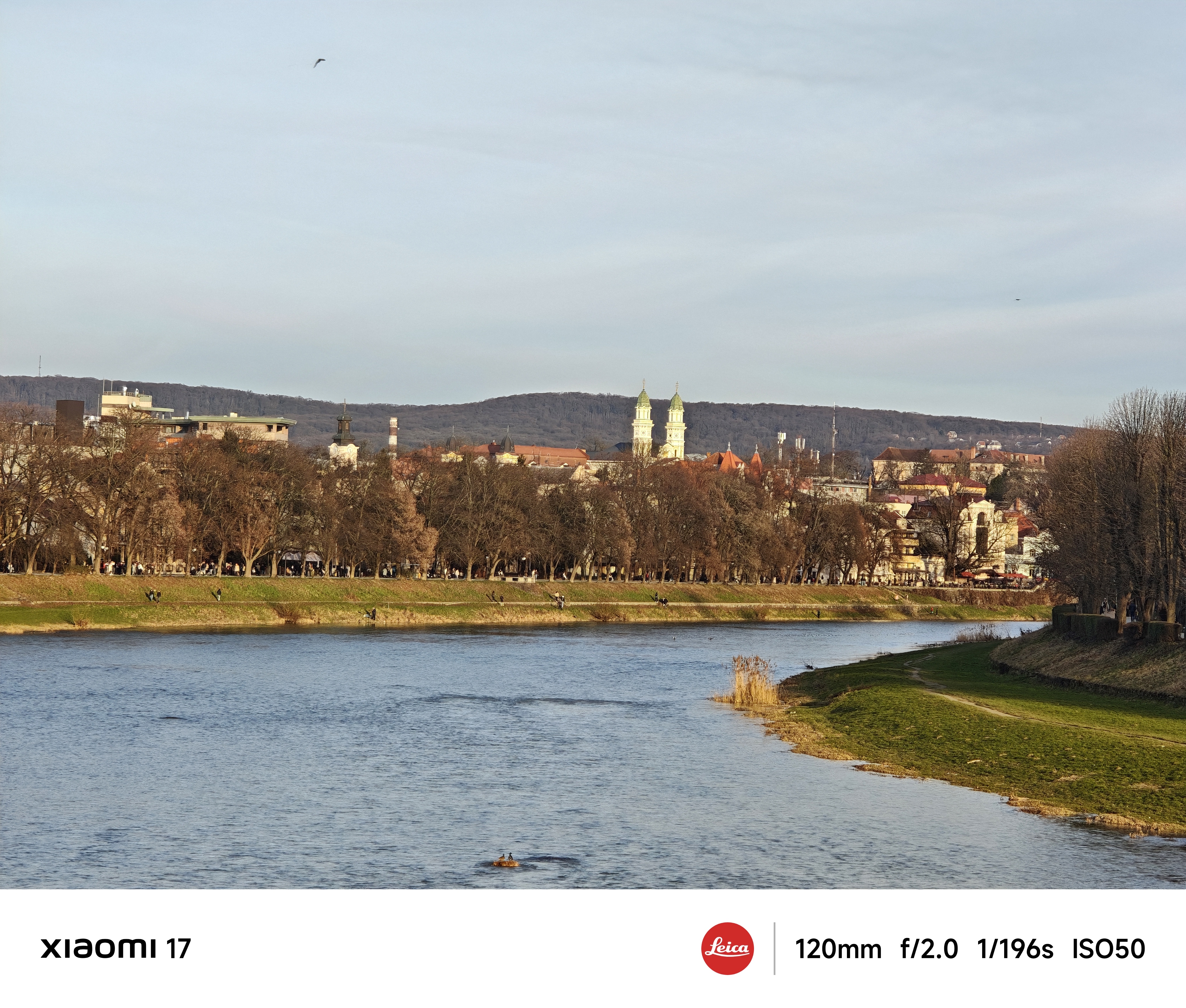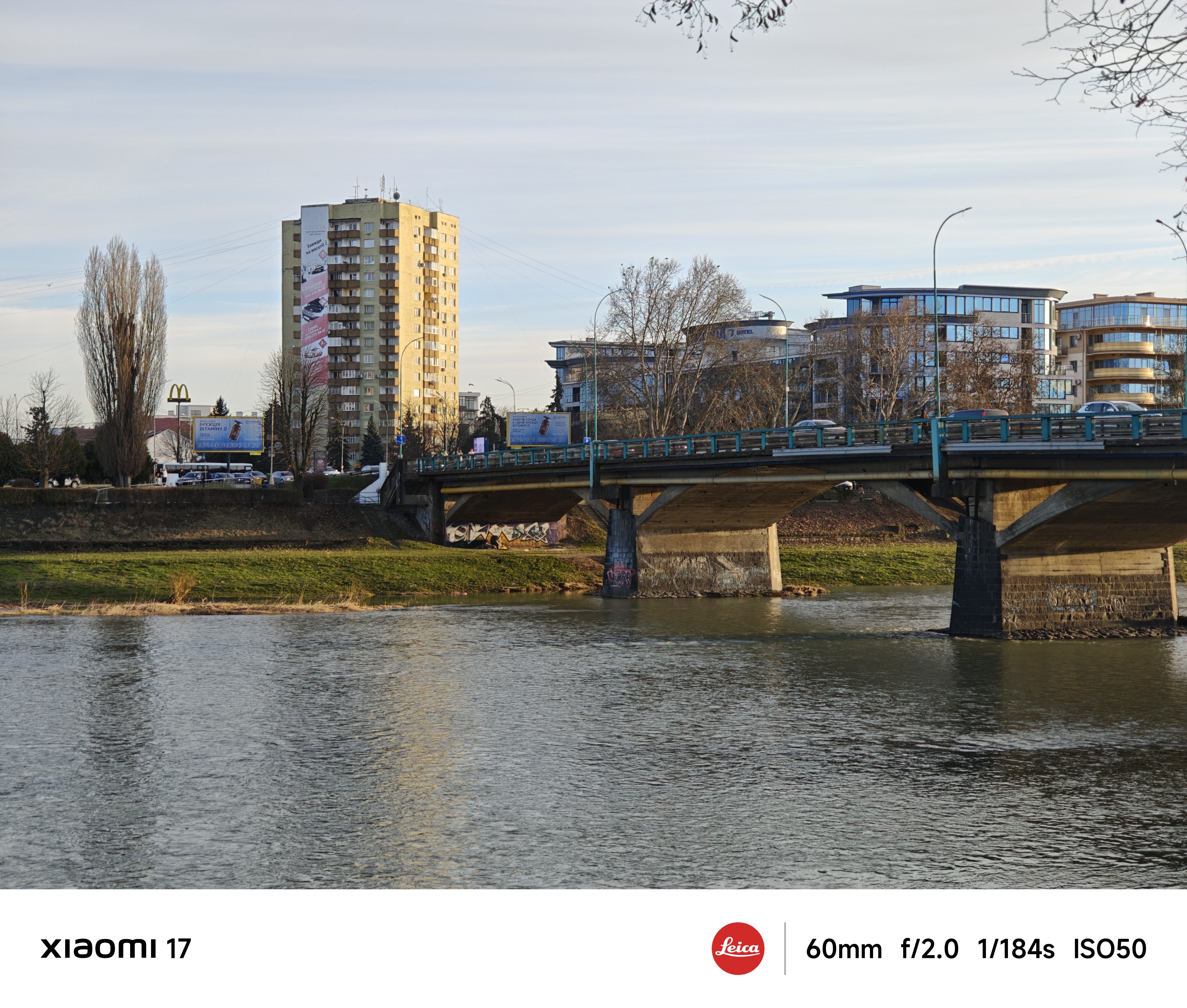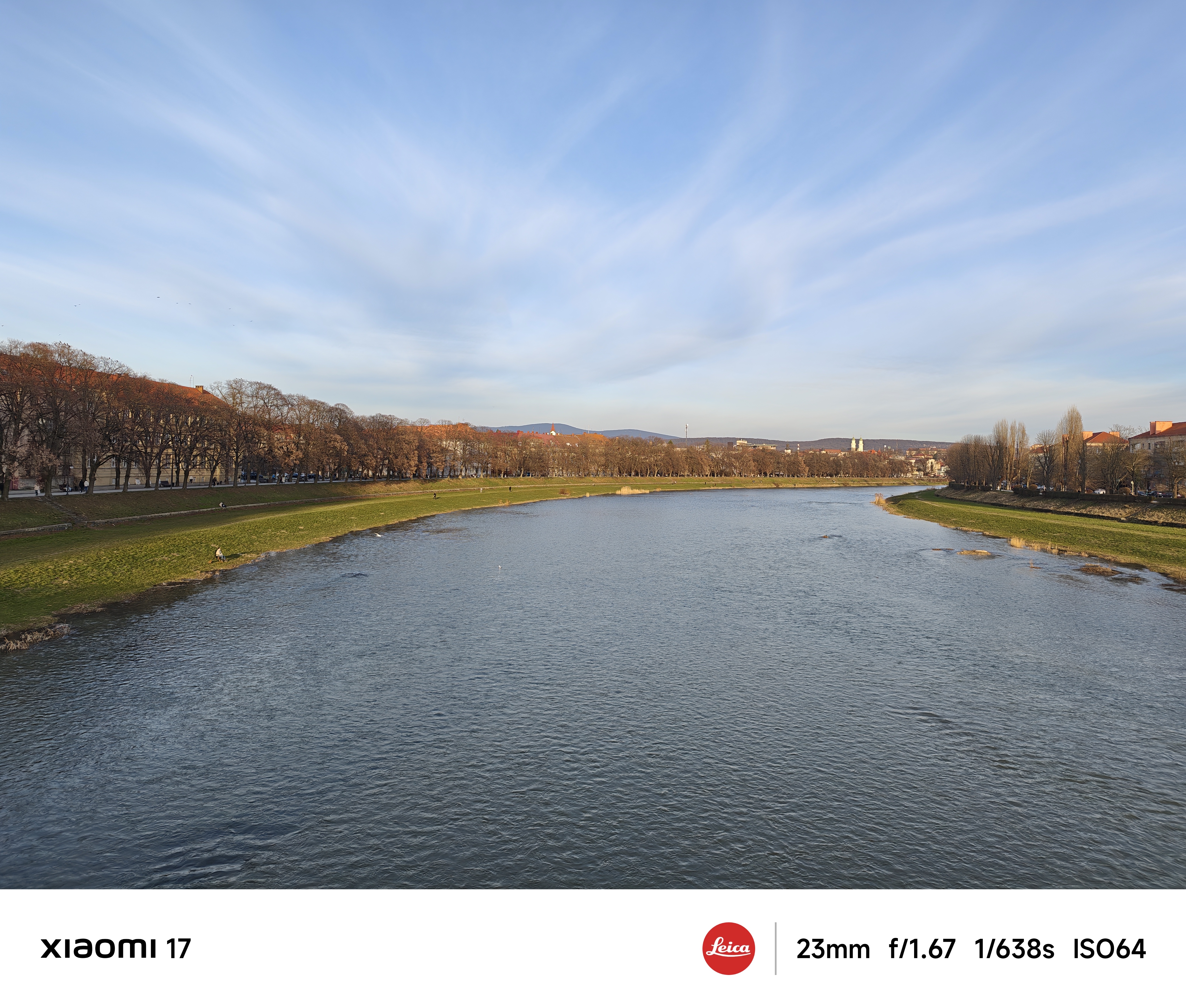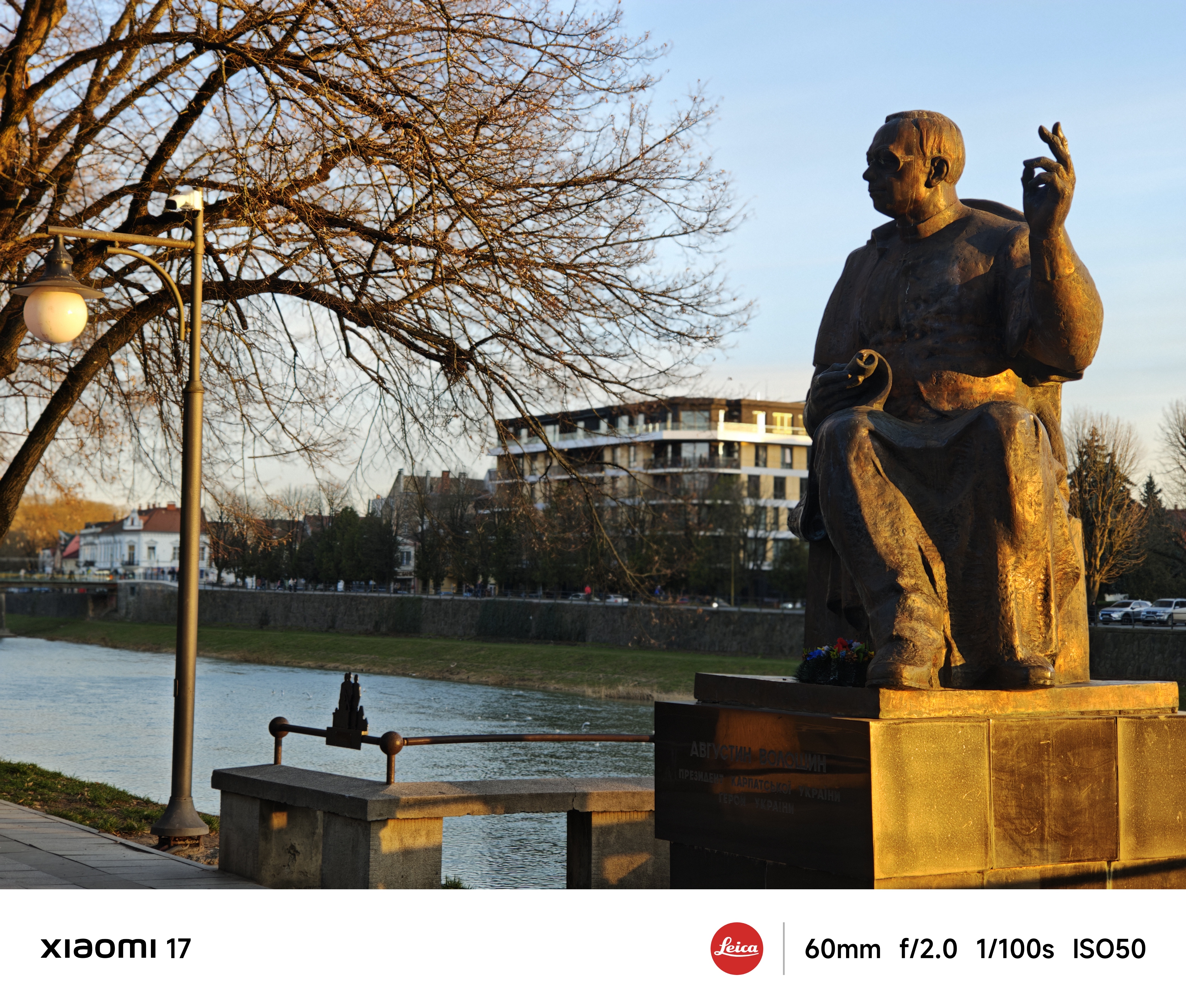 Основна камера використовує оптику Leica Summilux з високою світлосилою f/1.67 і чудово знімає в умовах слабкого освітлення. Еквівалентна фокусна відстань лінзи складає 23 мм, це типова ширококутна камера загального призначення. Всі тестові фото нижче наведені без обробки, зйомка в автоматичному режимі з рук. Щоб показати параметри зйомки, я спеціально увімкнув їх відображення на фірмовій стрічці внизу кадру.