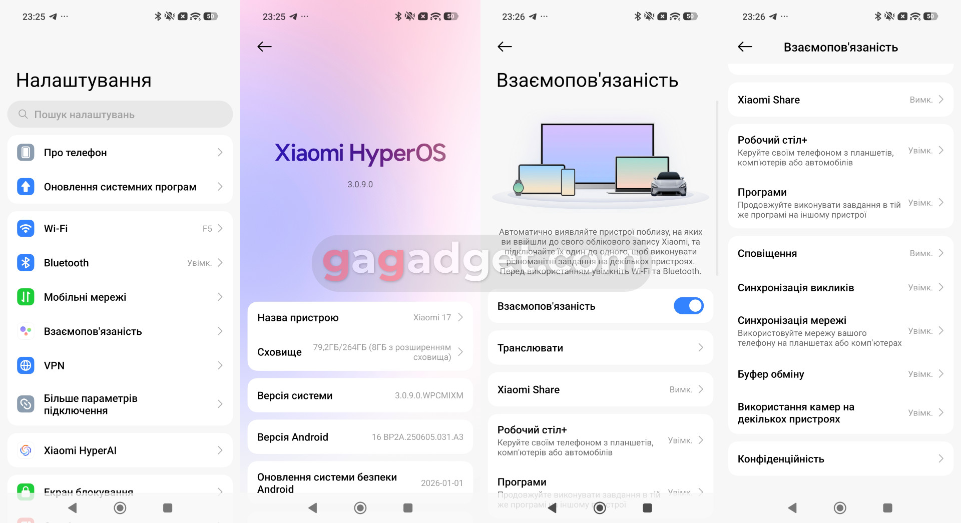 Xiaomi 17 поставляється з Android 16 та оболонкою Xiaomi HyperOS 3. Якщо ви раніше користувалися смартфонами цього бренду, то знайдете все на своїх місцях. Окрім реклами у системних застосунках: на відміну від молодших серій, тут її немає. Якщо не користувалися, то звернете увагу на базові передустановлені програми: МіБраузер, файловий менеджер, галерею, плеєр, власний магазин застосунків GetApps (не лякайтеся, звичайний PlayMarket теж на місці) тощо. На відміну від Huawei, яка відійшла у власний закритий всесвіт, Xiaomi повністю підтримує всі стандартні можливості платформи Google. Але при цьому працює над різними інтеграціями, зокрема, є багато можливостей по неперервній роботі та обміну даними між різними пристроями.