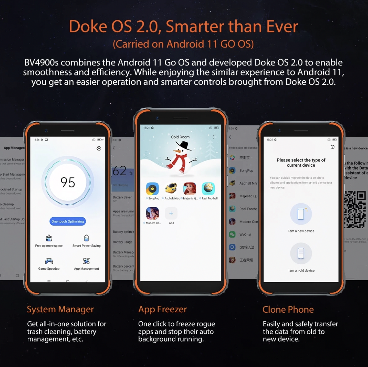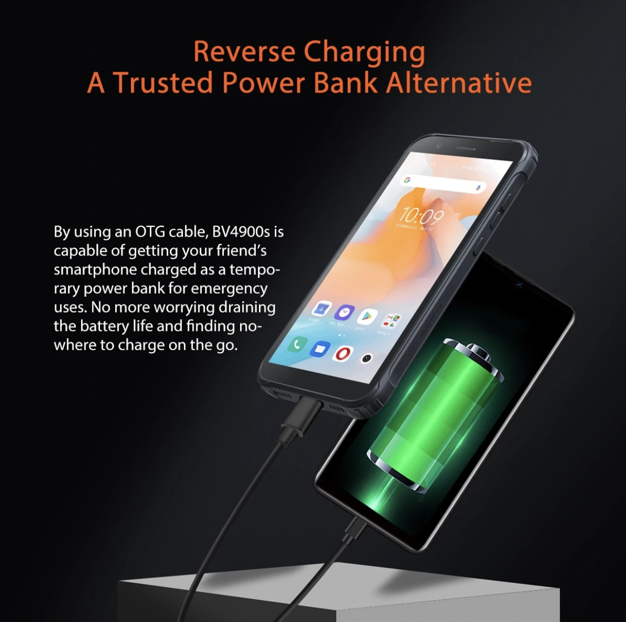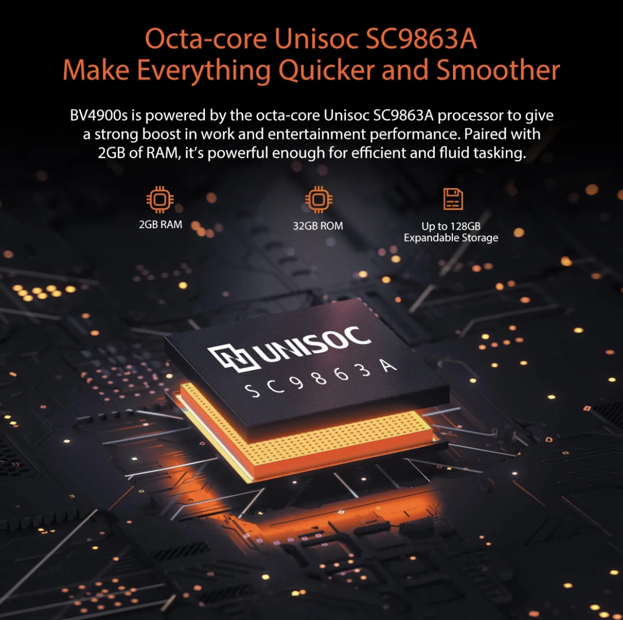 Працює апарат під керуванням восьмиядерного чіпа Unisoc SC9863A в парі з 2 ГБ оперативної пам'яті та 32 ГБ ПЗП. При бажанні вбудований накопичувач можна розширити картою пам'яті microSD. Також пристрій отримав екран на 5.7 дюймів з роздільною здатністю HD+, загартоване скло Dragontrail, основну камеру на 8 МП та фронтальну на 5 МП. Живиться апарат за допомогою акумулятора на 5580 мАг. Він, до речі, підтримує функцію павербанка. Тобто за допомогою Blackview BV4900S можна заряджати інші гаджети.