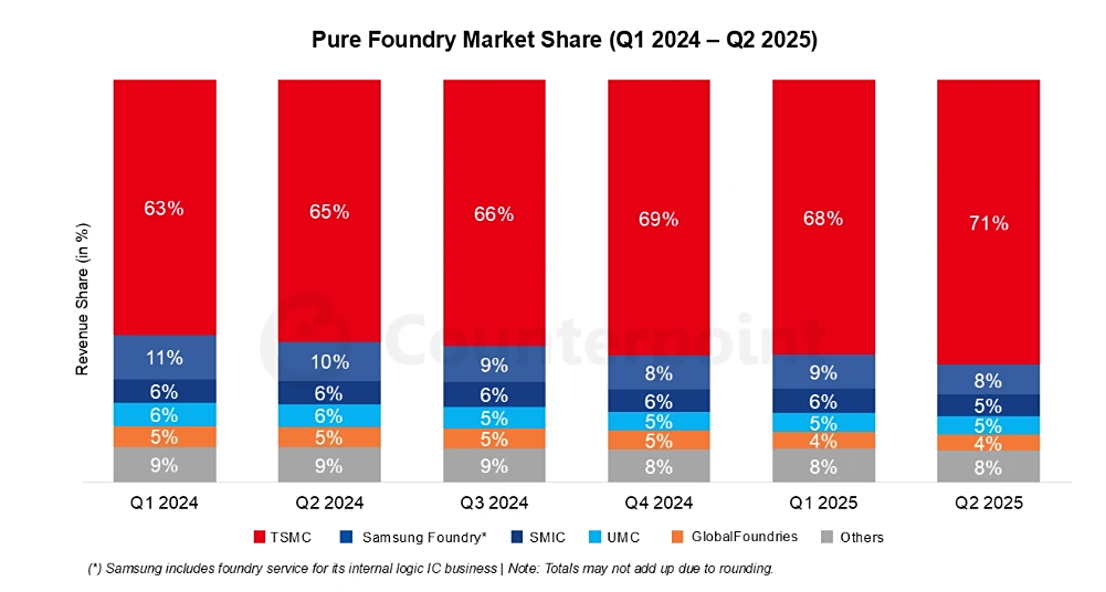 Аналітична компанія Counterpoint Research проаналізувала ринок чипів за останні квартали і показала цікаву статистику. Загалом ринок чипів відчутно росте на хвилі популярності AI (майже на 20% у грошовому еквіваленті — співставно з постковідними часами), але вигоду з цього отримують зовсім не усі. TSMC, яка рік назад займала 2/3 ринку, продовжує збільшувати свою долю. А в абсолютних числах цей приріст є ще більш вражаючим.