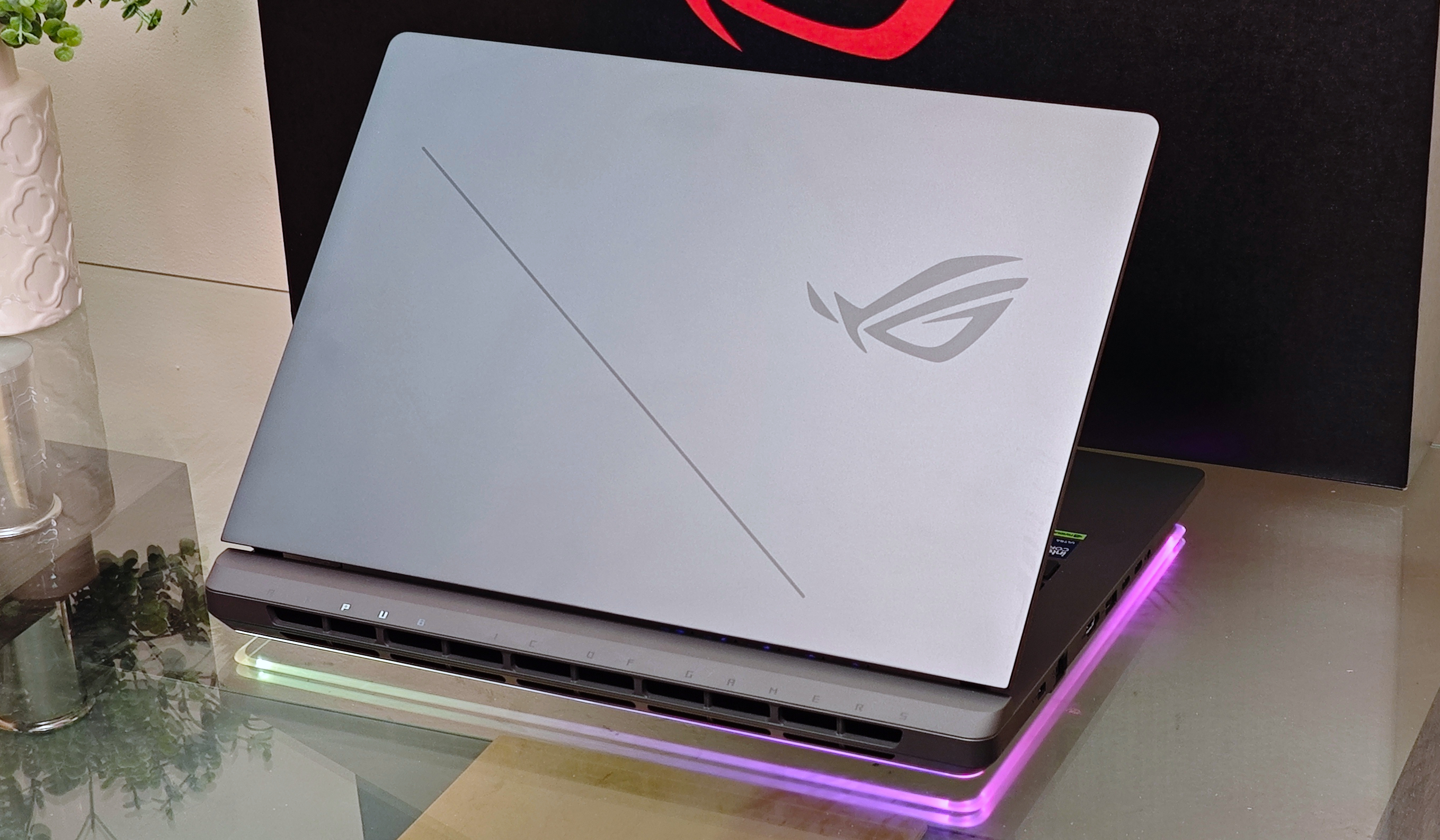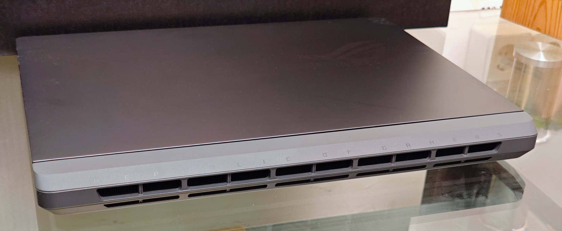 Єдиний металевий елемент конструкції — верхня кришка. Вона також приємного сірого кольору і має матове покриття. На ній декоративна діагональна смужка, а також логотип лінійки Republic of Gamers.