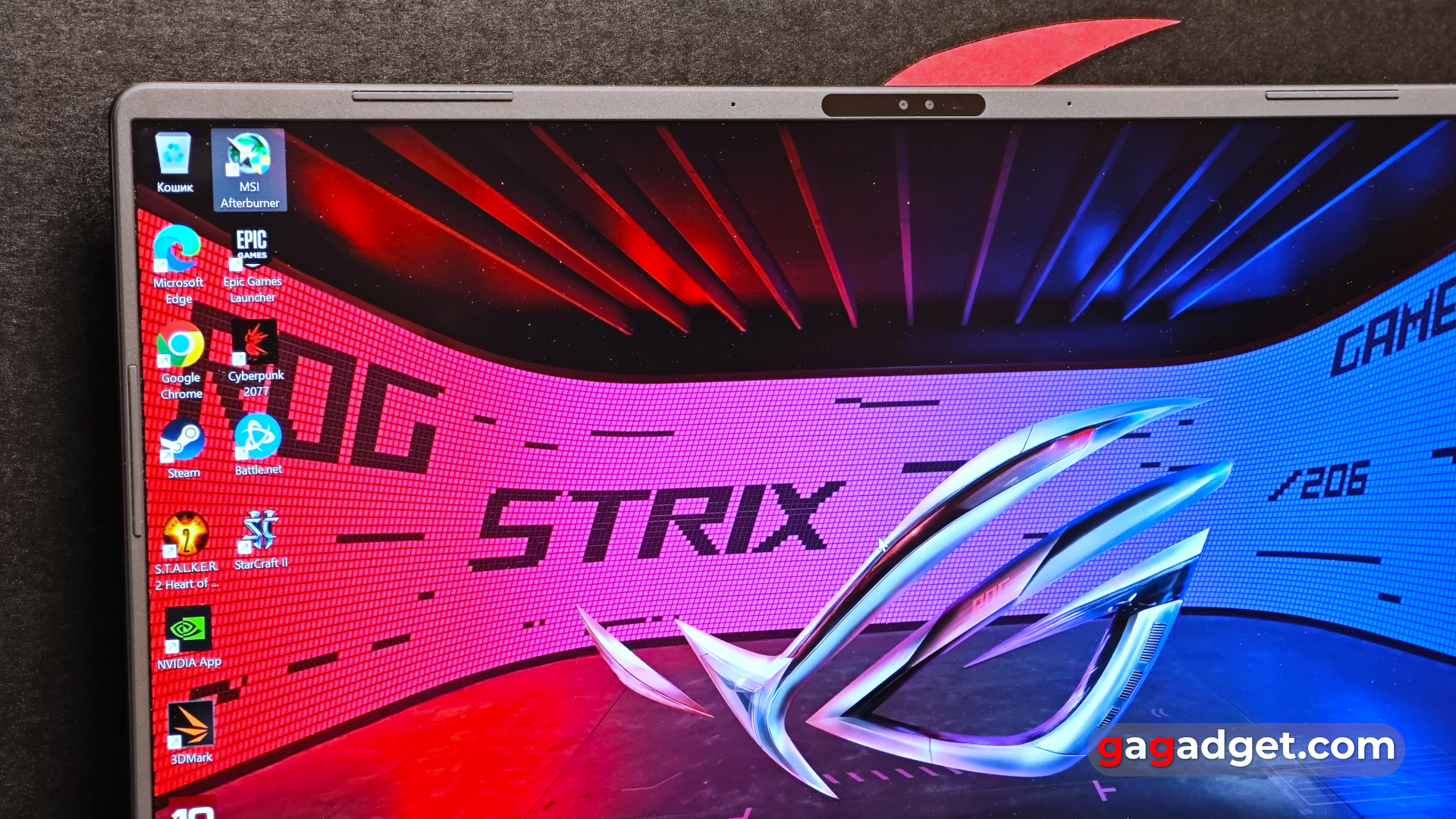 Тонкі рамки навколо екрана вже давно стали нормою і для ігрових ноутбуків, ASUS ROG Strix G16 (2025) — не виключення. По периметру є гумові вставки. Над екраном — два мікрофони, FullHD веб-камера з індикатором роботи, а також інфрачервона камера для ідентифікації власника.