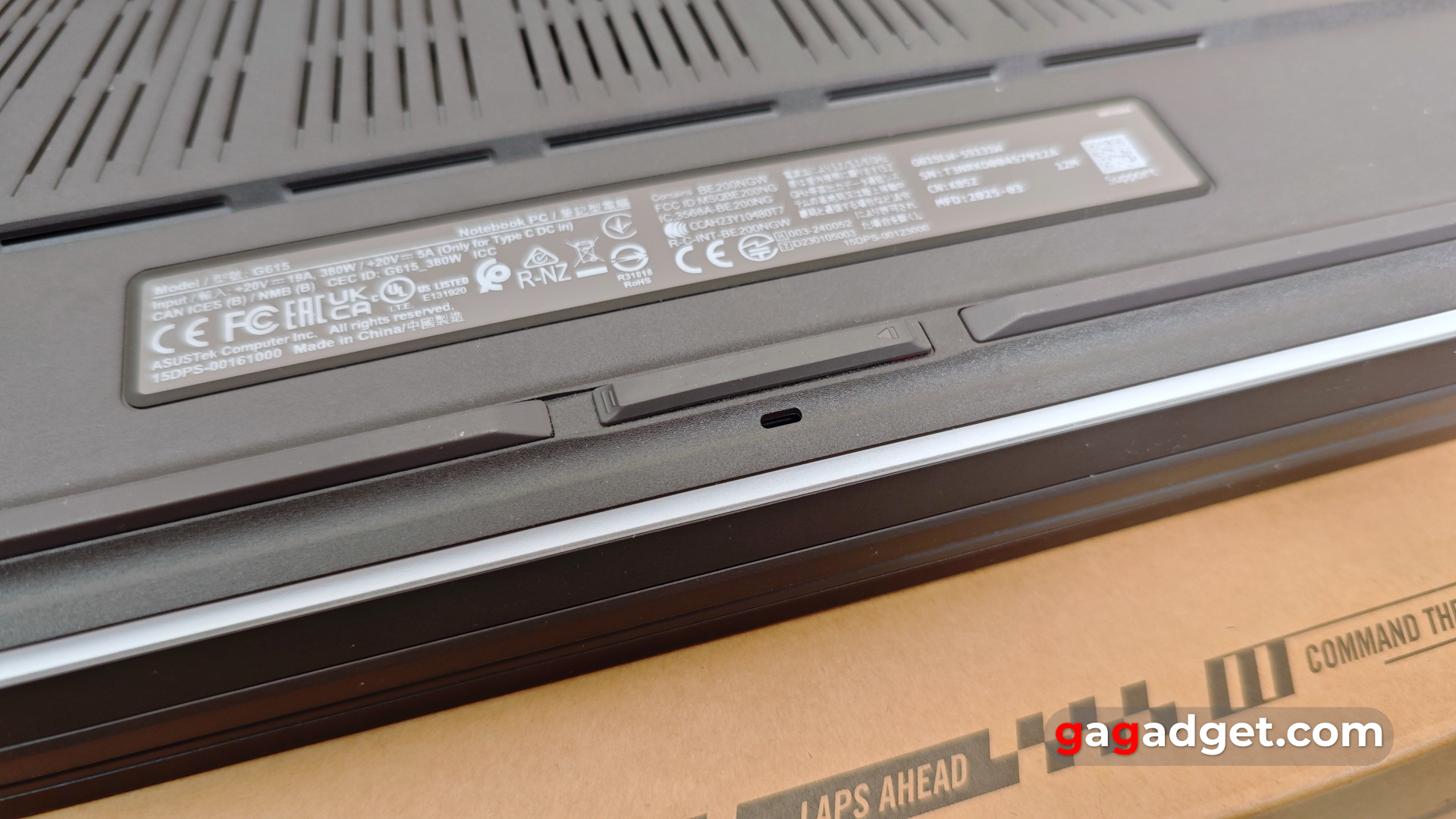 На нижній кришці ASUS ROG Strix G16 (2025) багато отворів для охолодження зі стилізованим написом ROG Strix. Спереду і ззаду є широкі гумові смужки для запобігання ковзанню по столу. У передній частині посередині є один доволі незвичний елемент. Це — фіксатор нижньої кришки. ASUS вирішила максимально полегшити користувачам доступ всередину. Потрібно просто відкрити фіксатор і зсунути кришку. Більше ніяких гвинтів та викруток.