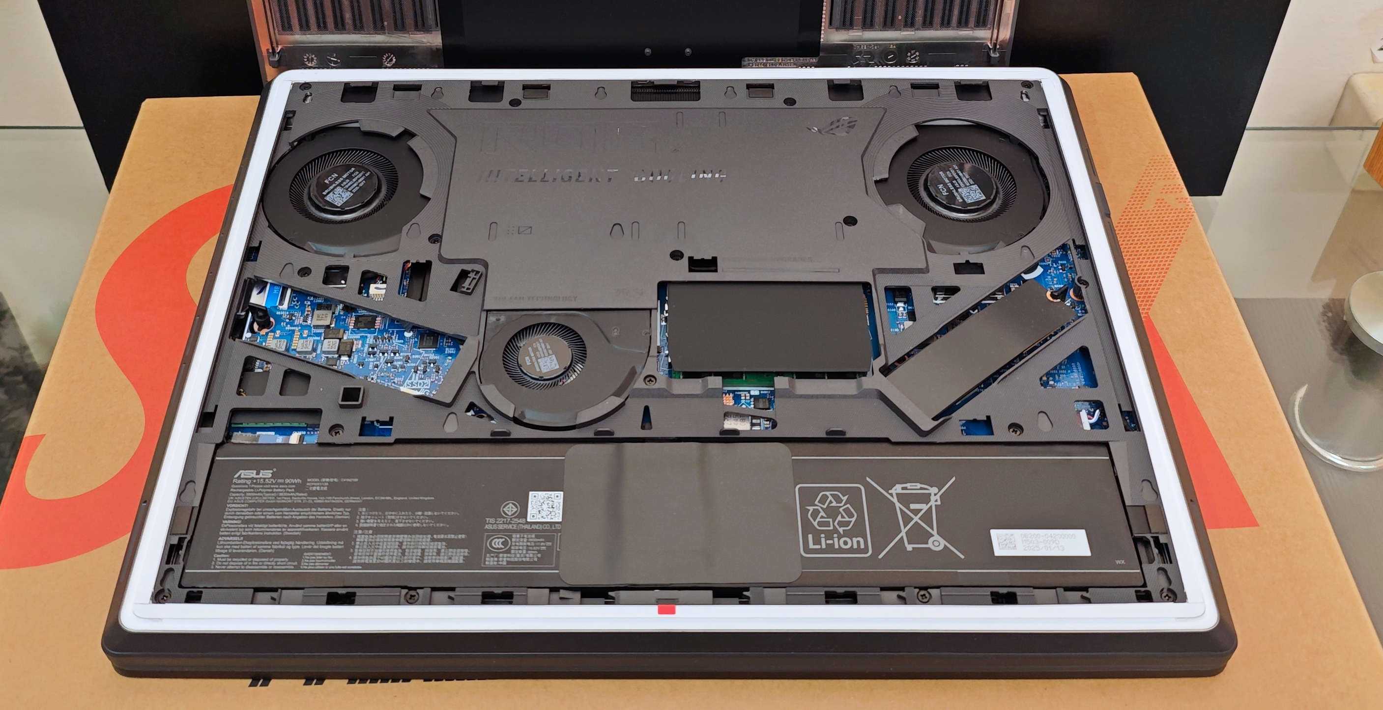 Система охолодження ROG Intelligent Cooling в ASUS ROG Strix G16 (2025) включає в себе багаторівневий радіатор і випарну камеру майже на всю ширину корпусу та три вентилятори Arc Flow . У якості термоінтерфейса і на процесорі, і на відеоприскорювачі використовується рідкий метал Thermal Grizzly. Забір холодного повітря відбувається не тільки знизу і з боків, а і через клавіатуру.
